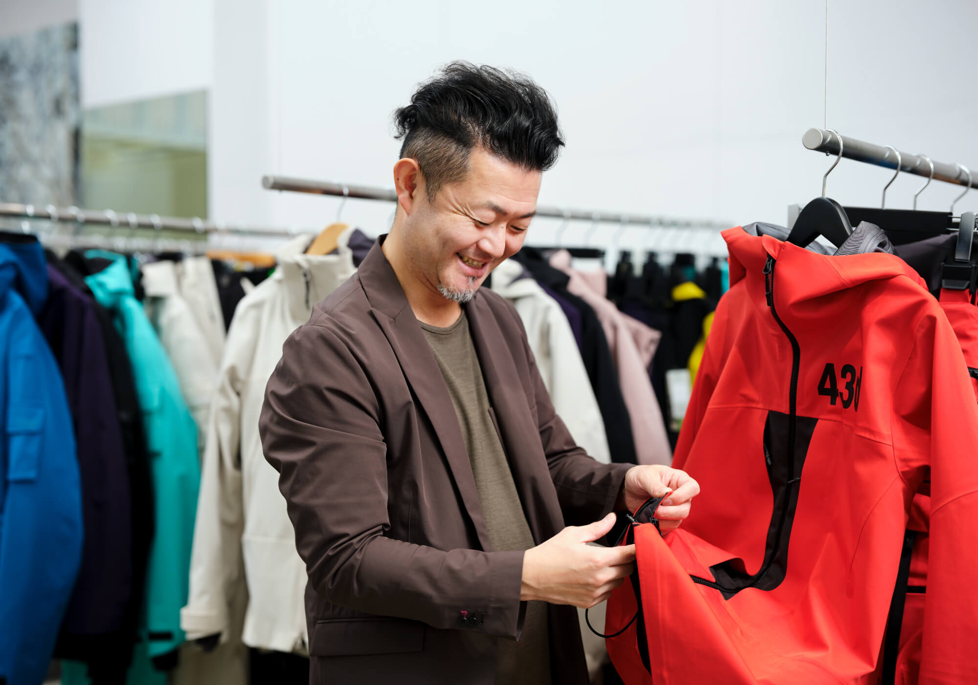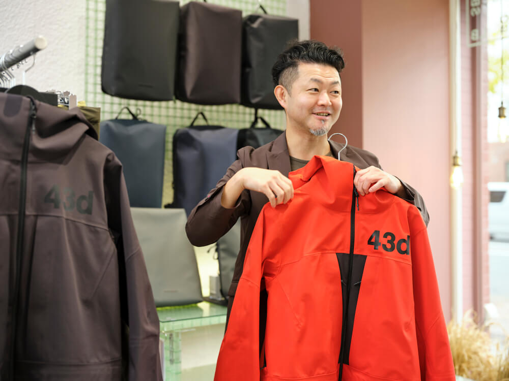 株式会社フォーシーズンズ取締役の沼田大資さんにお会いするために訪ねたのは、1950年(昭和25)から続く古いビルの1階。武骨で無機質なショップの空間には、「北方圏でつくられる一番山に近いウェア」をテーマにした、北海道発のアパレルブランド「43DEGREES(フォーティースリーディグリーズ)」のアウターが並んでいました。モノトーンから鮮やかな色まで、単色でありながらもオリジナリティのある色あいが目を引きます。