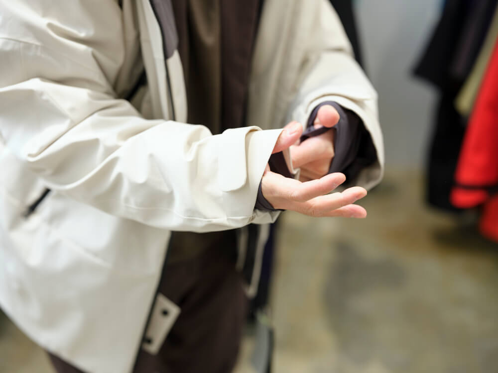 汗を逃がすベンチレーション、タブレットまで入る大容量のインナーポケット、外から直接インナーポケットにアクセスできる開口部。フードは硬さの異なる生地を組み合わせて立体的なシルエットを保つ設計。縫い目を出さないハンドゲーター、大きめのシルエットでも体にジャストフィットさせる調整コード、トイレで着脱しやすいボトムスのデザイン、怪我をしていても片手で着脱しやすいベルトの工夫。クールなアウターの裏側に、こんなにも多くの機能が潜んでいるとは!沼田さんの解説の様子は、まるで次々と技を繰り出すマジシャンのようでした。