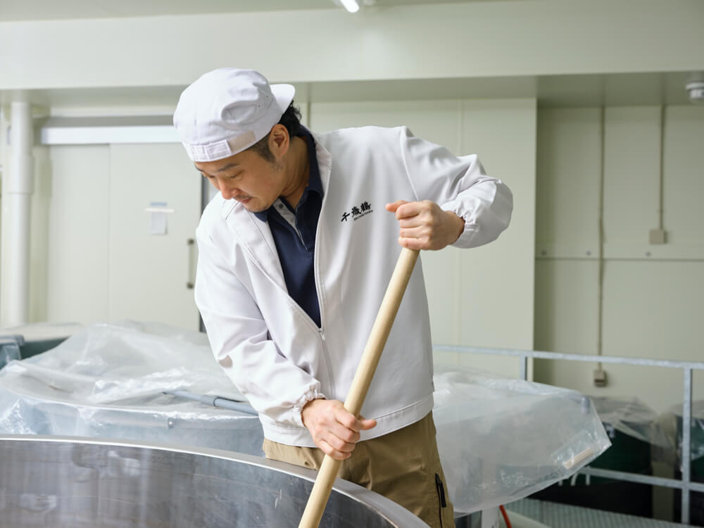 千歳鶴の酒造りは、蔵人8人によるチーム戦です。蔵の中では多くの工程が手作業で行われており、酒が人の手で醸されていることを実感します。だからこそ竹花さんは、「酒造りは人づくり」という先人の言葉を胸に、経験の浅い蔵人の育成に力を注いでいます。