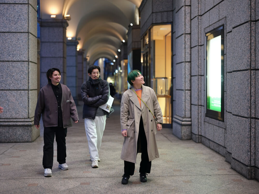 2025年11月のある日、大丸札幌店1階のコリドール(外廊)には3人の姿がありました。京都を拠点に活動する美術家の久門剛史さん、札幌駅前通まちづくり株式会社の今村育子さん、そして大丸札幌店の澤田。この日に行われていたのは、サッポロ・パラレル・ミュージアムの会場となるコリドールの下見です。