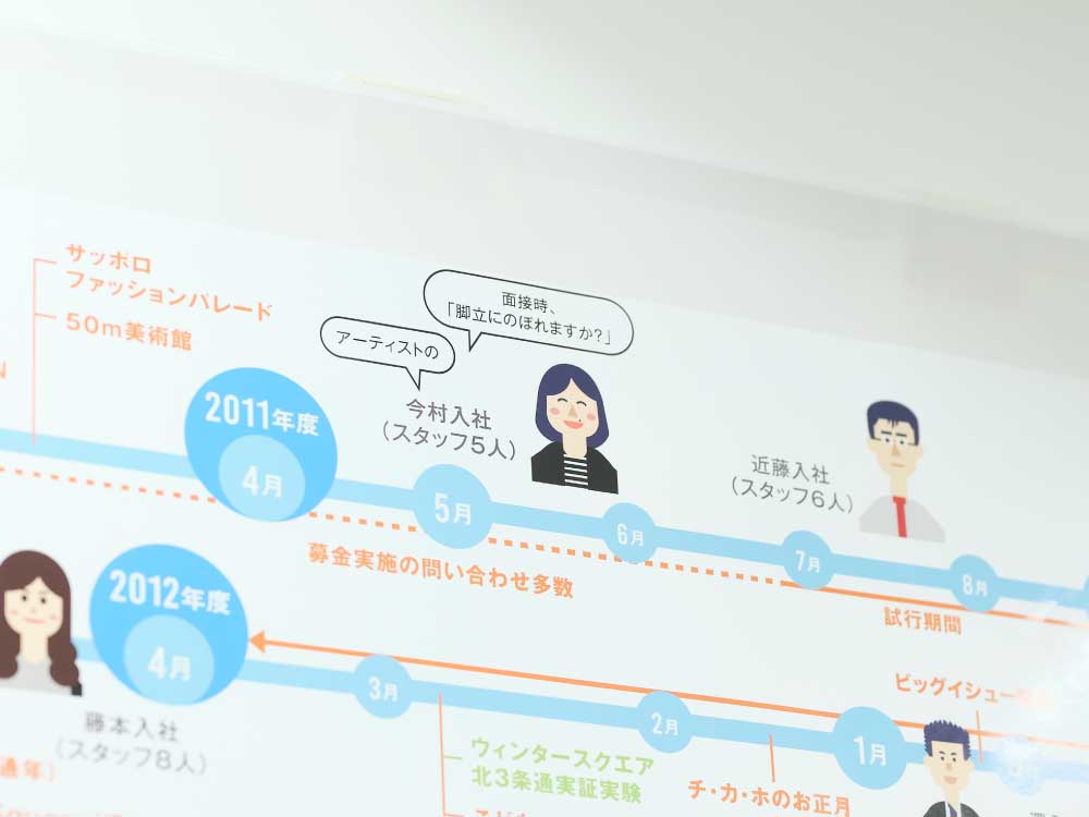 自己表現を世界と接続させる方法を考え続けていた今村さんの意識が、アートを通して人やまちをつないでいく方向へと変化したのは、設立から半年ほどの札幌駅前通まちづくり株式会社に入社してから。チ・カ・ホ オープン時のチラシ制作をきっかけに、創作活動を通して出会った人たちからの推薦を受けて入社したのは2011年のことでした。
