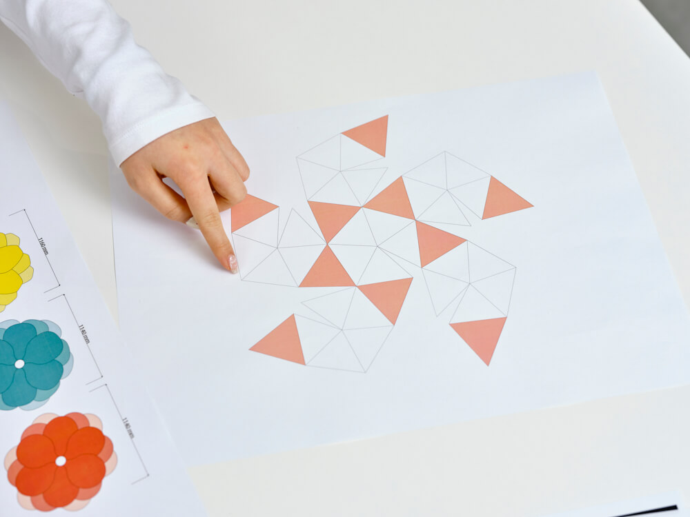 そう話すのは、株式会社京屋 北海道営業部 デザイン課の中川斐世利さん。見せてくれたのは、カラー出力した紙を切り貼りして手作りしたカラフルな花の模型です。これは2026年3月18日から大丸札幌店の店頭に春を運ぶ、大きな花のオブジェを制作するための最初の小さな試作品。実際の春装飾では、一つが70センチ近い大きさの花になる予定で企画は進行しています。