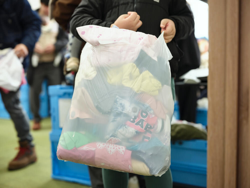 服を持ち込み、持ち帰るという仕組みに加え、「袋にどれだけ詰められるか」という楽しさが、この交換会の大きな特徴です。譲る・もらうだけではなく、体験として楽しめる工夫が多くのリピーターを生む理由のひとつ。