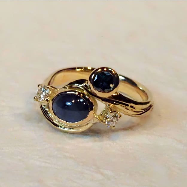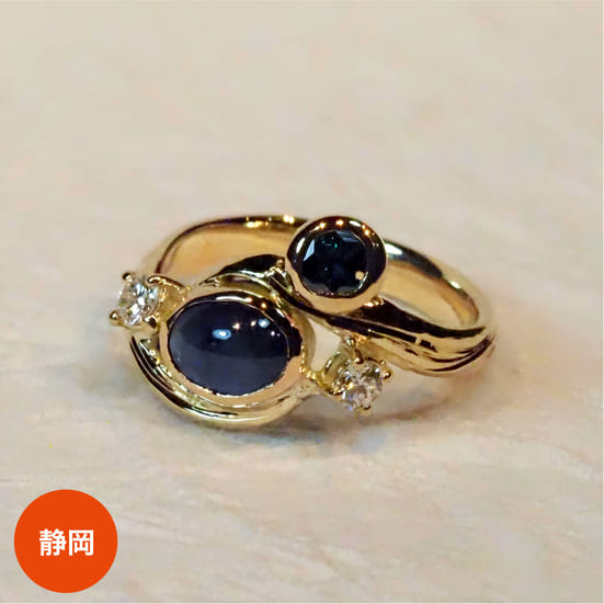 スリランカ産サファイアと希少なブルーダイヤモンドを使い、星が零れ、降り注ぐような夜を表現しました。伝統工芸の技術とアートな表現。地金を叩き、彫り、磨いて仕上げる。全ての行程がハンドメイドだからこそ、そこには一点物の美しさが宿ります。