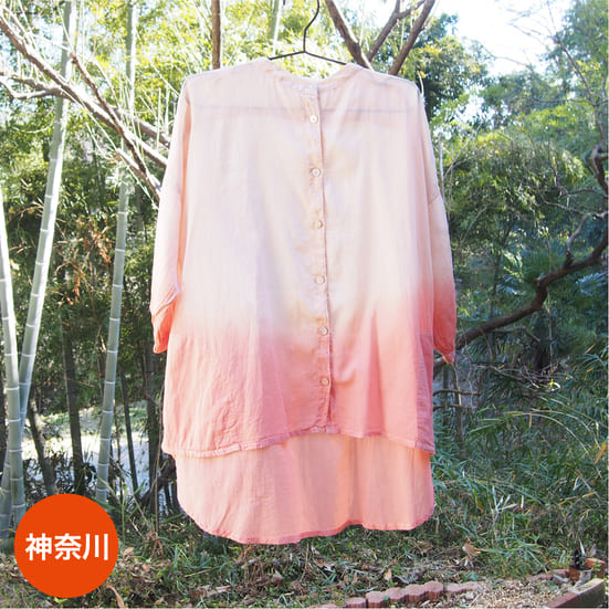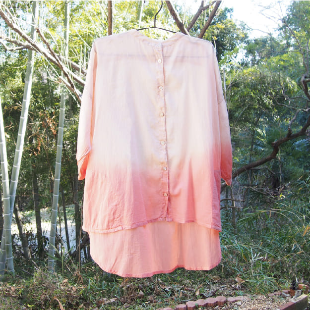 軽やかで透け感のあるボイル生地を、桜とインドアカネでやわらかなグラデーションに染めあげた一着。一点ずつ手作業で染められているため、同じ柄はひとつとして存在しない独自の色合いが魅力。桜染めのブラウスやストール、ハンカチなども豊富にご用意。
