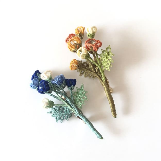 極細の糸で編んだお花と葉っぱを束ねた、花束のようなブローチ。お花の中には天然石も使用しています。タティングレースのモチーフをひとつずつ丁寧に結って、ガラスや天然石、メタルパーツと組み合わせて。繊細でカラフルなレースのアクセサリーです。