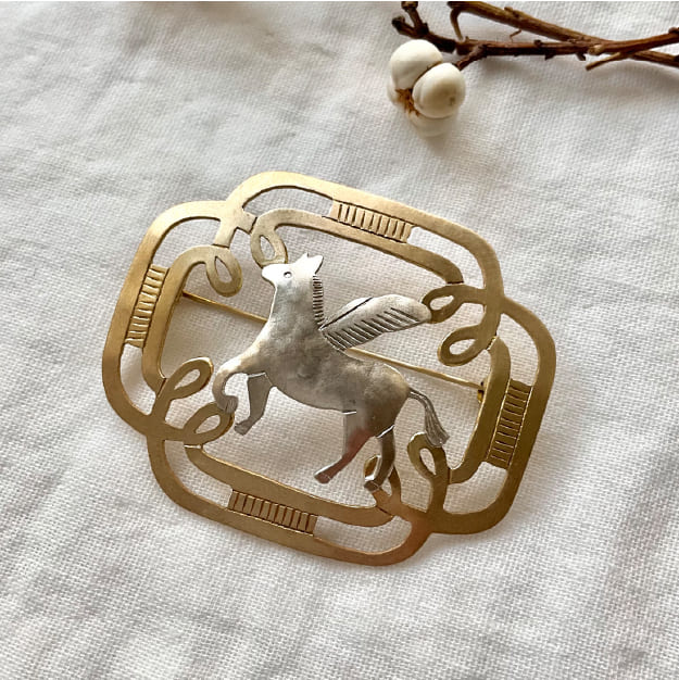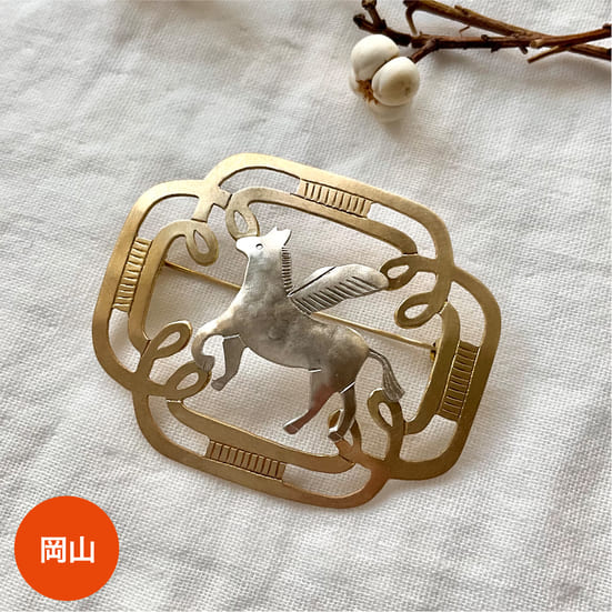 2026年の午年にちなんで制作したブローチ。透かし彫りした真鍮と銀をロウ付けで組み合わせました。日々の中で出会う自然や動物などさまざまな事象を切り取り、主に真鍮の温かみある経年変化を楽しんでいただける装身具を中心に制作しています。