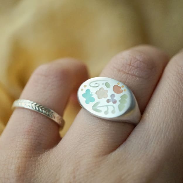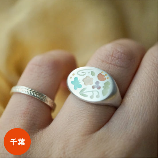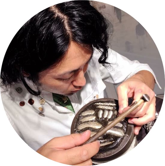 クレヨンで落書きするみたいに、思いつくまま描いたかたちをひとつひとつ、シルバーリングに焼き付けました。イタリアで学んだ洋彫りをはじめ、子どもの頃の楽しい思い出や感性が表現された、伝統とオリジナリティを大切にしたアクセサリーを作っています。