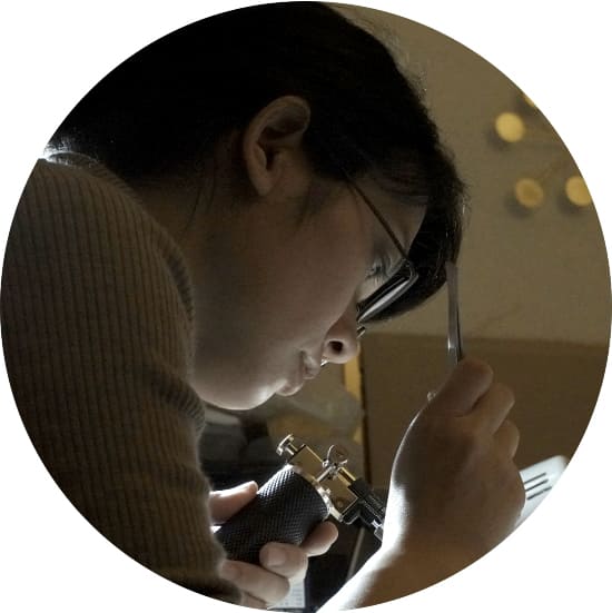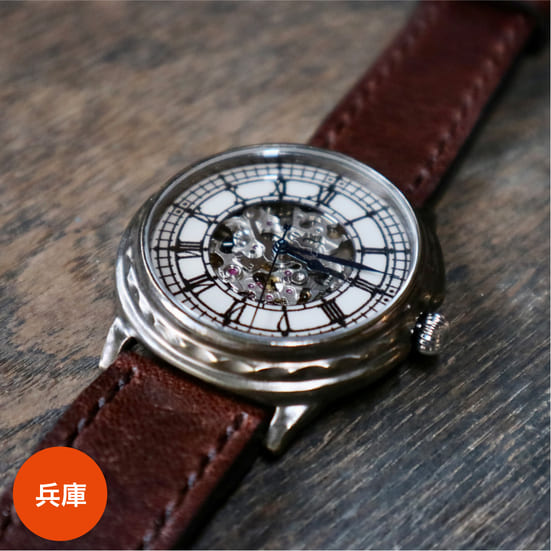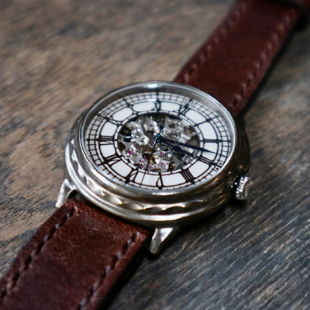 手間暇をかけ、技術と知識をもってケースや文字盤、ベルト、バックル部分を組みあげられた時計。手作業ゆえ、一つひとつすべての色合いや形が違う唯一無二。長く使えるデザインと使用感も特徴。手作りならではの世界でひとつの経年変化や味わいが楽しめます。