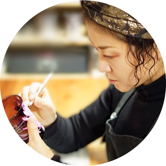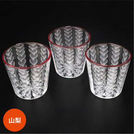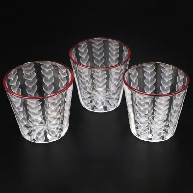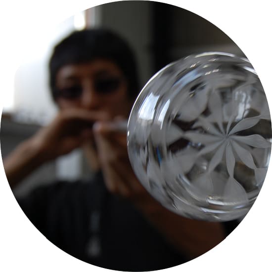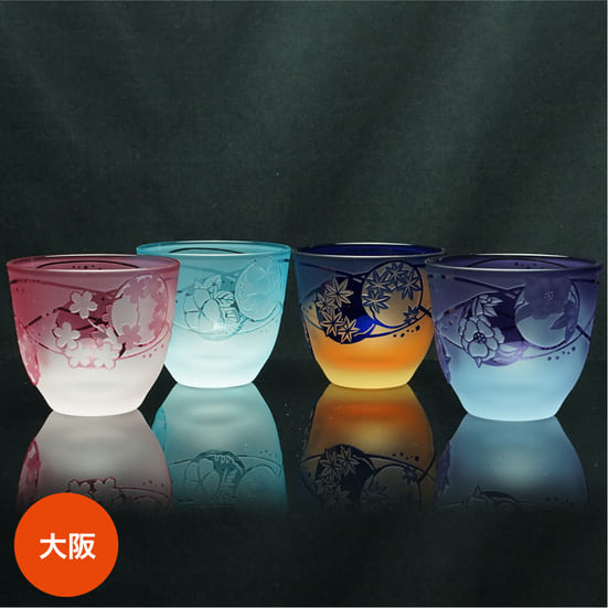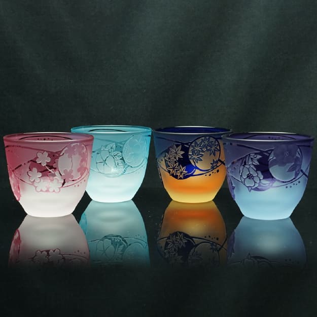 四季それぞれのうつろいをデザインし、サンドブラスト彫刻で仕上げました。「輪」に柄を納めつなぐことで永遠の祈りを込めています。日々の暮らしの彩りとなるように、一つひとつ手仕事で仕上げたグラデーションの美しいサンドブラスト彫刻を製作しています。