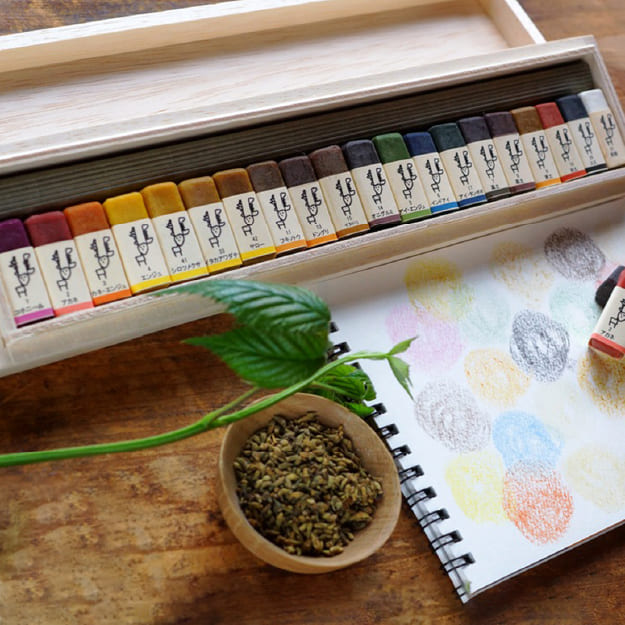 化学系・石油系のものは一切使わず、植物の顔料や貝殻の粉末など、自然の素材だけで作られた水性クレヨン。アイヌの人々が語るように、木や草花にはそれぞれ神様が宿るといいます。そんな自然から少しだけ分けてもらった色。やさしく厳しい自然からの贈りものをどうぞお楽しみください。