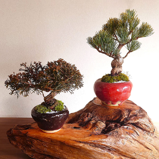 手びねりで自作した植木鉢などに植物、苔、溶岩石などで小さな庭園風景を表現しています。小さくても季節により変化していく姿を楽しむのは至福。また、カジュアルな盆栽や自然木・流木を加工して制作した花台も。そこに飾る事でまた違った表情へと変わります。