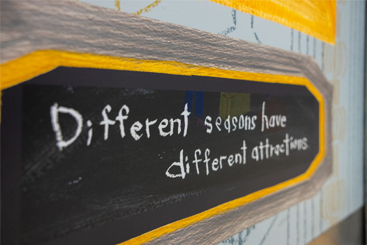 札幌で活動するイラストレーター・ノグチユミコさんのテッピは、トリックアートのようなデザイン。たくさんの絵が展示されているかのようです。さまざまな大きさで額装された絵は、札幌の四季や花からインスピレーションを受けて描かれています。