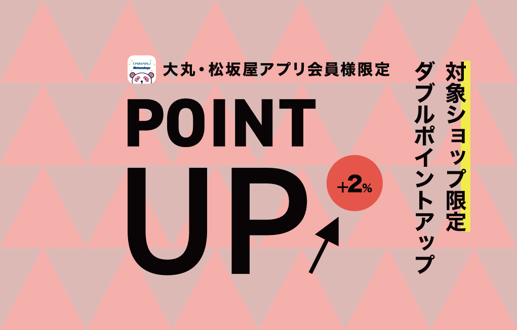 大丸・松坂屋アプリ会員様限定 ポイントアップ期間中、7階 対象ショップにて、通常の1%のポイントアップに加え、さらにプラス1%で合計プラス2%のダブルポイントアップ/ご優待アップを実施いたします。