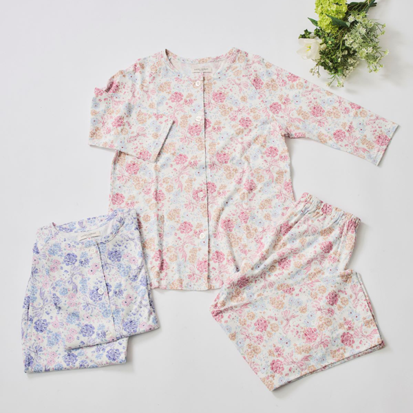 英国の花柄に包まれて、上質なくつろぎの時間を。水彩タッチのリボンとフラワーモチーフ柄。SZ 糸の天竺素材で伸縮性のあるさらりとした肌ざわりのよいパジャマです。ラグランスリーブなので、腕や肩を動かしてもつっぱりにくく、とても楽な着心地です。