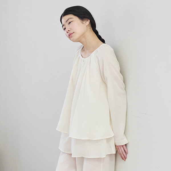 オーガニックコットン100%のガーゼ生地にギャザーを入れた、大人の可愛らしさをもつパジャマセット。前みごろは二重になっているため、気になる透け感もカバー。朝晩寒く感じる方…冷房は必須!だけど身体は冷えてしまう、そんな方におすすめです。