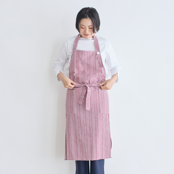 肌離れが良い素材、足さばきが良くなる深めのサイドスリット、首への負担が少ない太めのひもなど、家事を快適にこなせる工夫が詰まったエプロンは贈り物にもおすすめです。