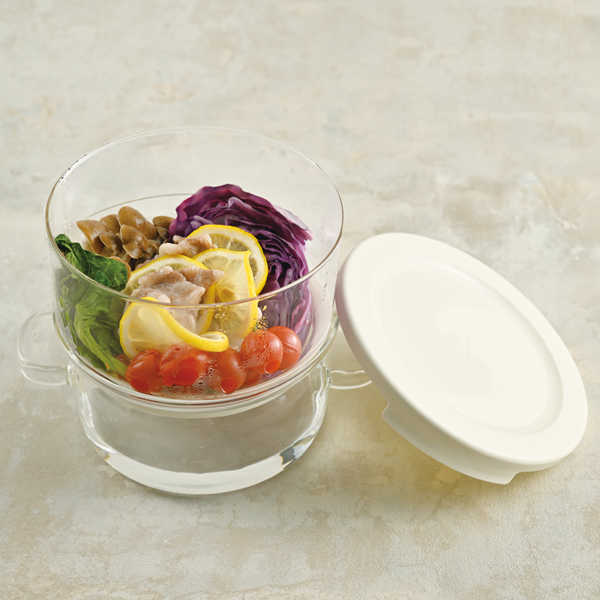 電子レンジ調理で「手軽さ」「ヘルシー」「タイムパフォーマンス」を叶える新しい蒸し器です。 一度の加熱で上下二段の調理ができ、主菜と副菜を同時に仕上げられるのが特長です。忙しい日でも、調理の手間と時間を抑えながら、バランスの取れた食事を用意できます。