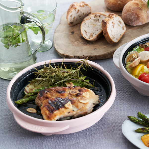 電子レンジ専用調理器具「レンジメート プロ」は1台で8つの調理が可能。フライパン不要で、魚や肉に香ばしい焼き目がつく本格仕様。調理後、そのまま食器の代わりとして食卓に出すことができるため、温かい状態の料理を楽しめます。洗い物を減らせるので家事の時短にも繋がります。