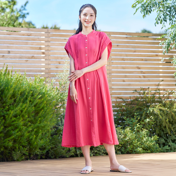 母の日に、素材で選ぶ涼やかな贈り物を。凸凹のある綿100%のクレープガーゼは肌に触れる面積が少なく、通気性抜群。汗をかいてもさらりと快適な着心地のワンピースでありがとうの気持ちを届けませんか。
