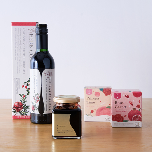 内容:ザクロ発酵エキス200g、おいしいハーブティー ローズガーネット10個入、プリンセスタイム10個入、ハーブコーディアル有機ゴジベリー&ザクロ360mL(計4点)