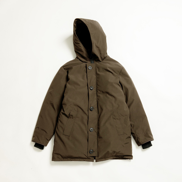 耐久性とはっ水性を兼ね備えたリサイクルエンデュラリュクス素材を用い、マットな質感と控えめな風合いが魅力。抜群の軽やかさで羽織る心地よさを実現し、機能的なシュノーケルフードと比翼仕立ての前立てが洗練されたデザインを際立たせています。