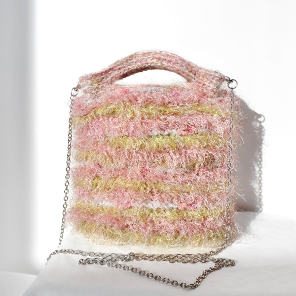 税込6,270円編み物作家・比野藤央が、異る素材や撚りのファンシーヤーンを組み合わせ、色の重なりにもこだわって仕上げたトートバッグ。やわらかな立体感と繊細なきらめきが、装いにさりげないアクセントを添えます。チェーンストラップ付きで、手持ちと肩掛けの2WAYでお使いいただけます。