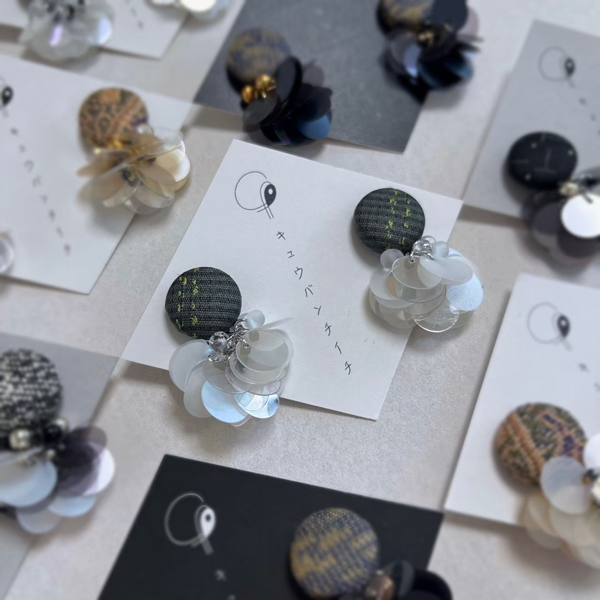 各税込3,700円さまざまな質感や織の異なる生地で包んだボタンに、軽やかなスパンコールをあしらったアクセサリー。身につける方の個性にそっと寄り添い、日常から特別なシーンまで幅広く楽しめます。札幌を拠点に活動する2人組のアクセサリー作家が、生地選びからこだわり、一つひとつボタンから制作しています。