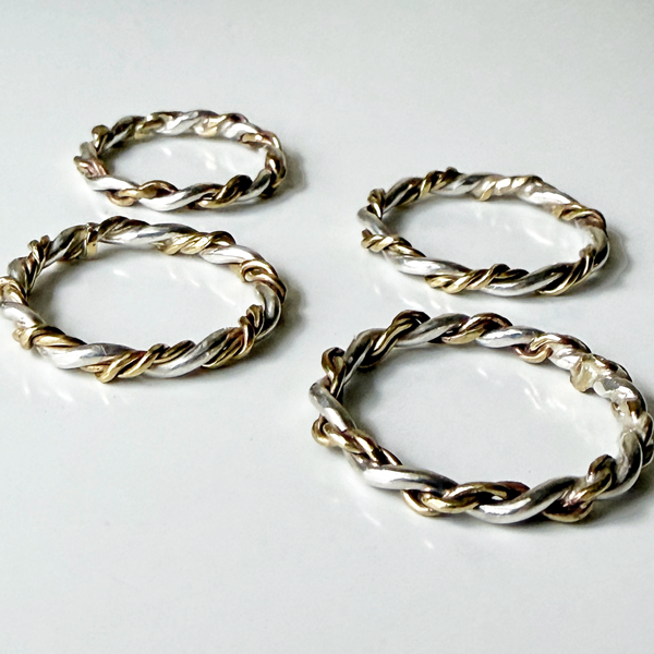税込7,700円シルバーと真鍮の異なる素材が美しく絡み合うツイストリング。2つのカラーが織りなすコントラストが、手元にさりげない存在感をプラスします。1本でも重ね付けでも映えるデザインです。ハンドクラフトならではの〈ラウ〉の世界観をぜひご覧ください。
