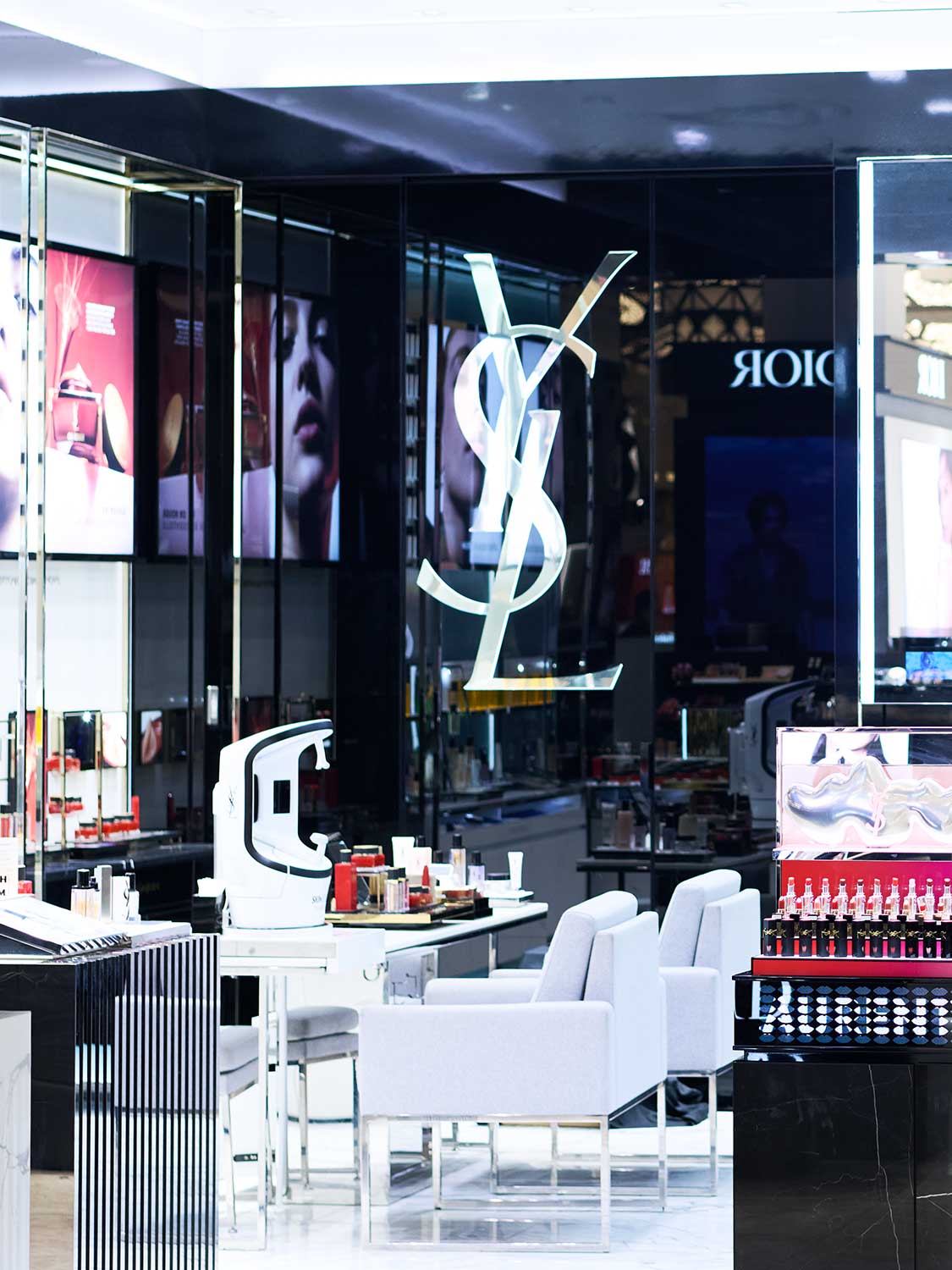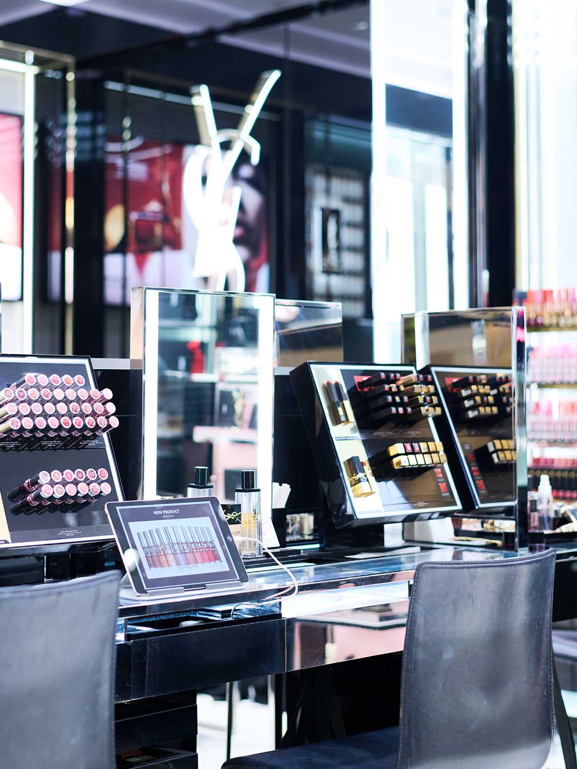 ルックスと機能性を兼ね備えたYSLの製品をフルラインナップした店内にはスペシャルなトレーニングを受けたメイクアップエキスパートが常駐。トレンドをバランスよく取り入れたタッチアップが可能です。