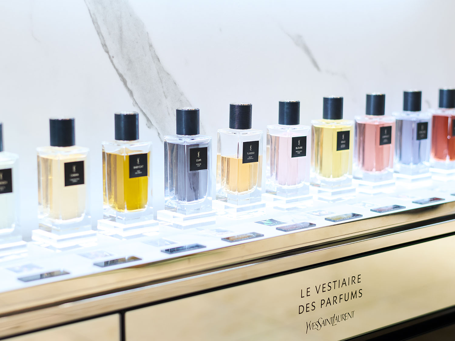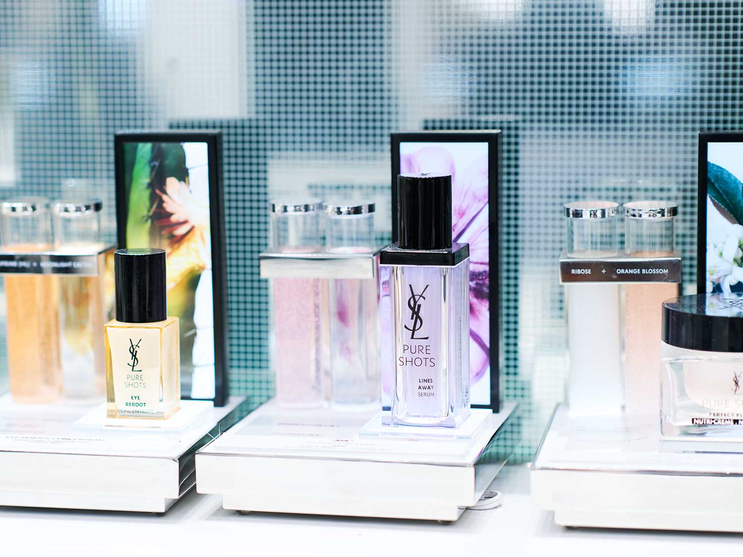 YSLの世界観を体現するような店内には、スキンケア、メイクアップ、フレグランスなどブランドの全カテゴリのアイテムがスタンバイ。関西圏には4店舗のみしか取り扱いのないリュクスなフレグランスライン、「ル ヴェスティエール デ パルファム」を取り扱っているほか、YSL独自のスキンエッジというマシンを用いた肌チェックも実施。睡眠やストレス、マスクによる摩擦など現代型ストレスからくる肌ダメージを解析し、最適なスキンケアの提案が受けられます。