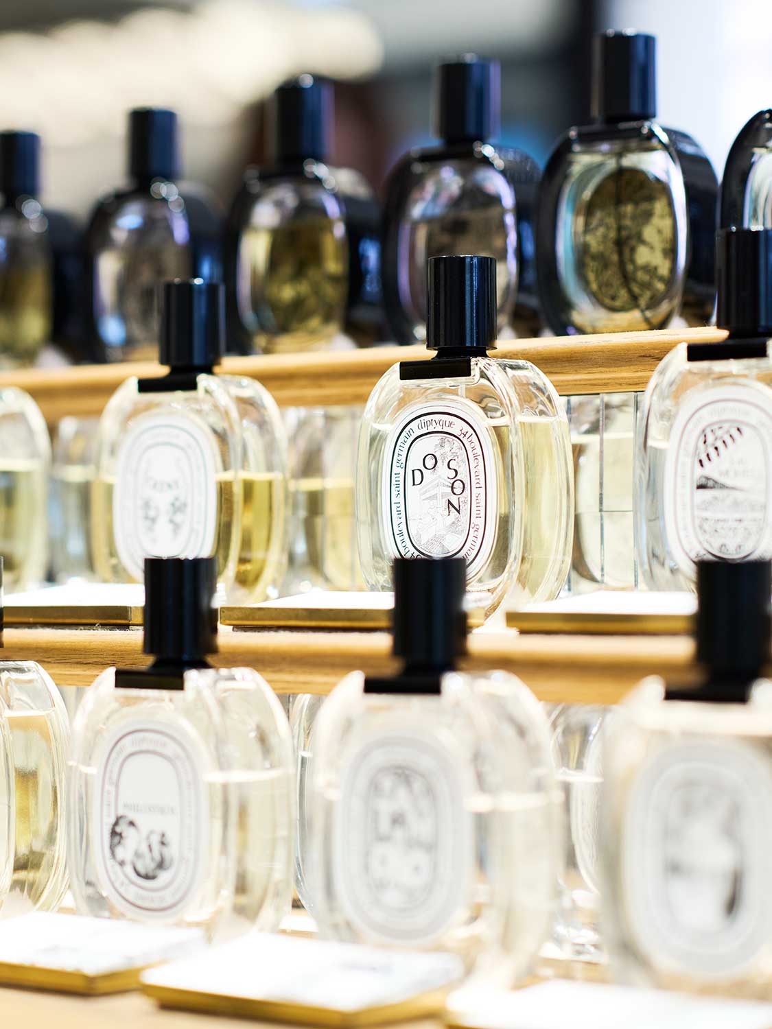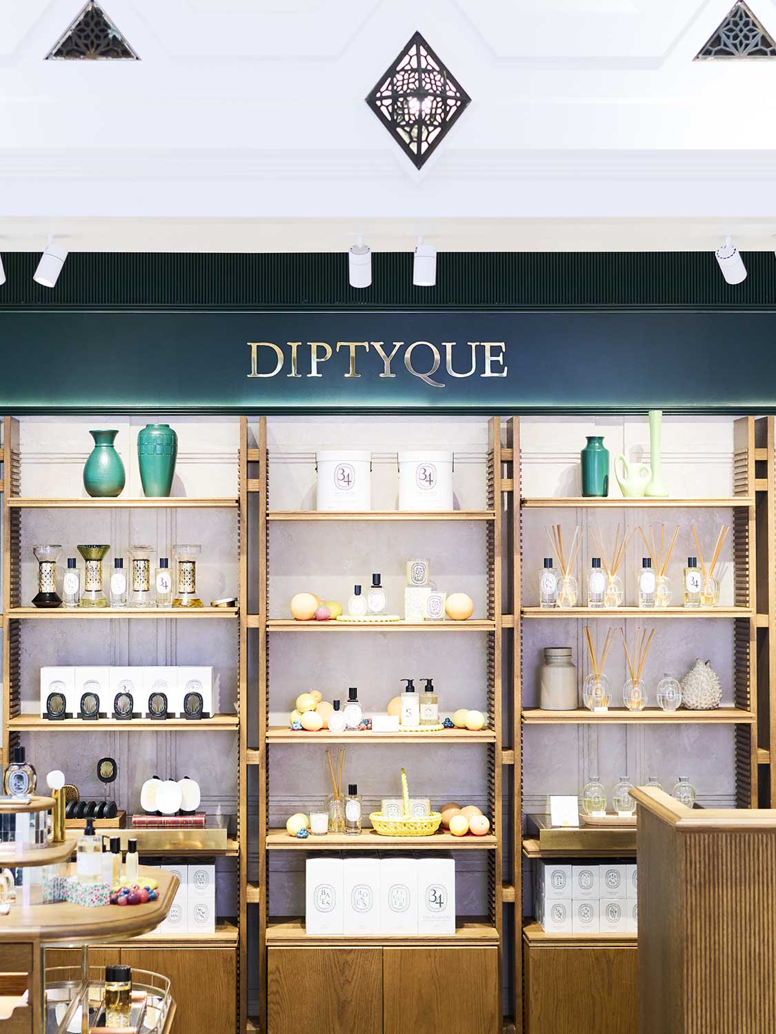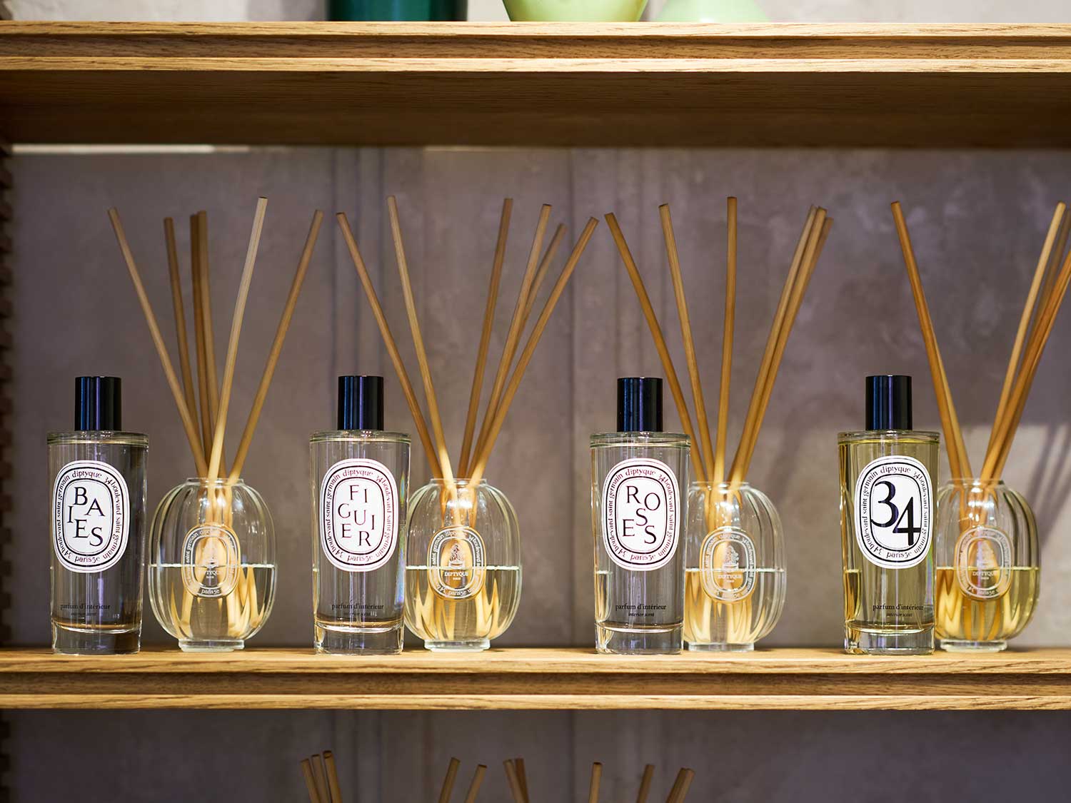 店頭ディスプレイには、それぞれのコーナーにディプティックの世界観が詰め込まれていて、フレグランス、キャンドル、ディフューザーなど、アートピースのようなパッケージと香りを実際に試すことができます。