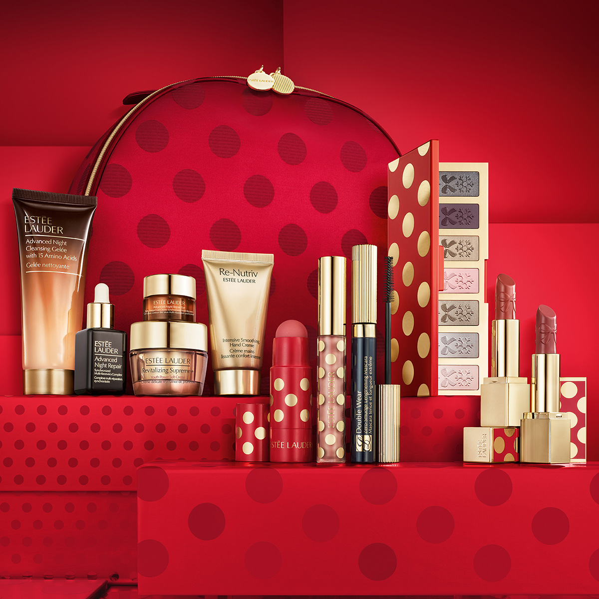 剱持:名品、アドバンス ナイト リペア コンプレックスやクレンジング、クリームにアイジェル、リップスティックにアイシャドウパレットやチークまで、欲しいものが集まった贅沢なラインナップ!