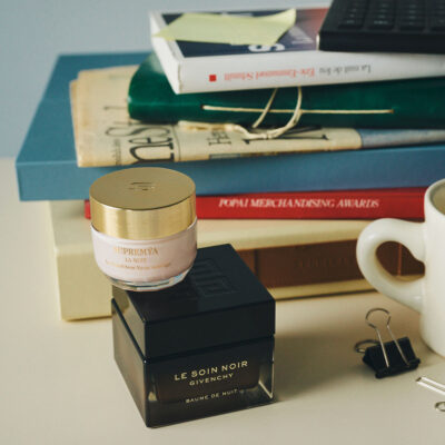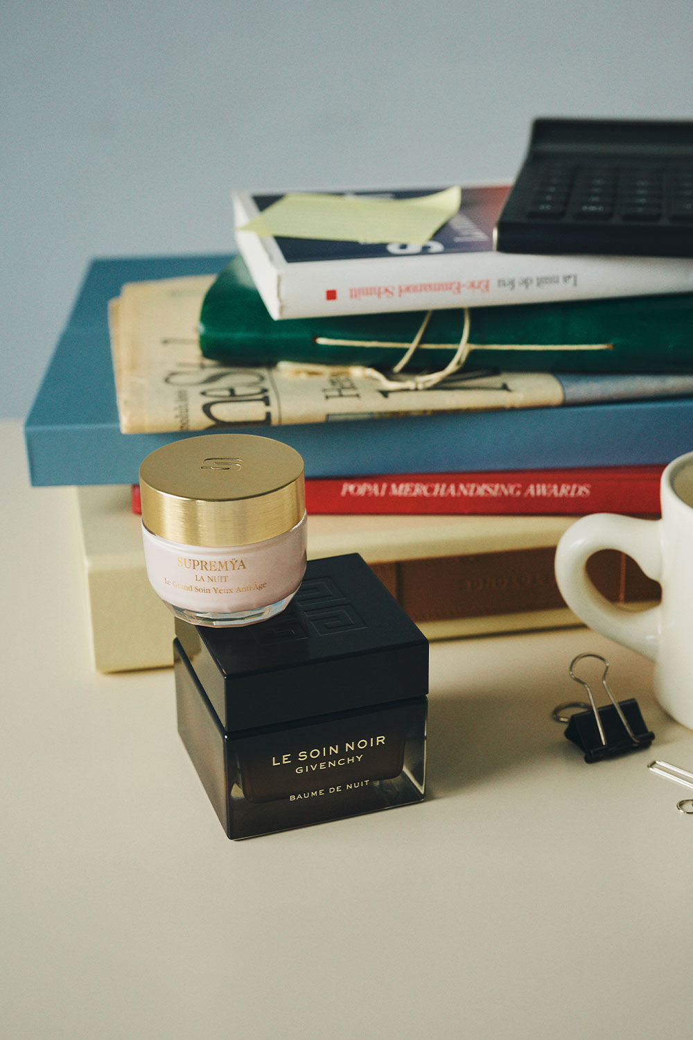 1日フルスロットルで頑張った自分へのご褒美は、ブランドのラグジュアリーアイテムを使ったお手入れタイム。それに相応しいのが、シスレーのスプレミヤ アイ クリームとジバンシイのソワン ノワール バーム ニュイ。シスレーのアイクリームは、ハリ不足、うるおい不足、キメの乱れなどのエイジングサイン*にアプローチするスグレモノ。付属のマッサージツールを使って、スマホやPCで酷使した目元を労わって。ジバンシイのクリームは、夜に満ちる肌サイクルに着目したナイトクリーム。肌を潤いで長時間守る“ラッピングテクスチャー”で、翌朝まで肌を守り、サポート。優れたアイテムで夜のお手入れを充実させれば、翌朝の肌はさらに美しくなる!