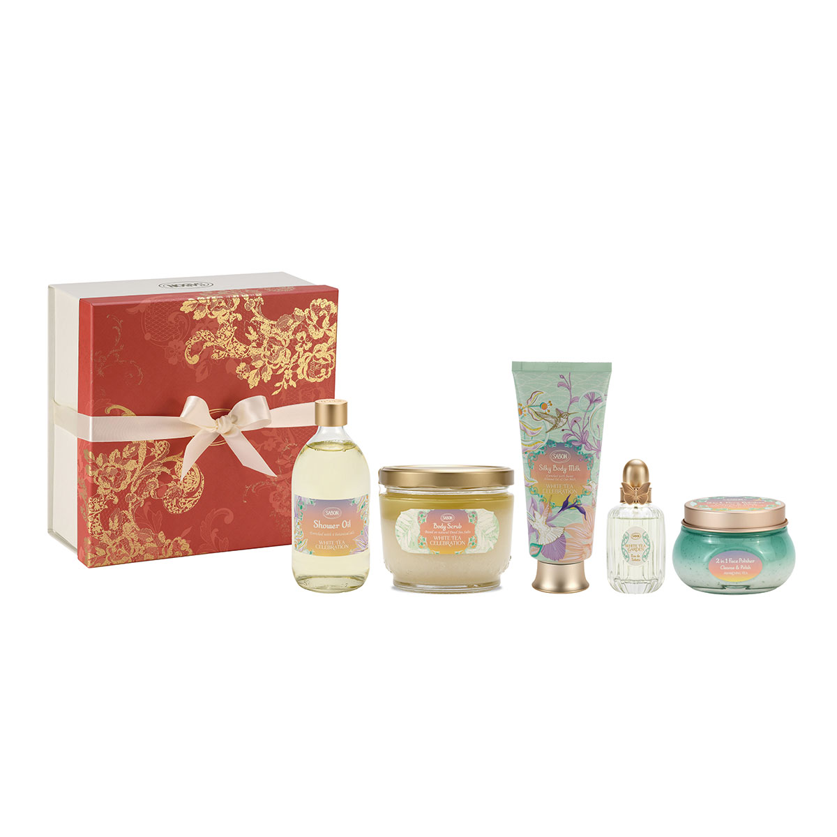 セット内容:シャワーオイル500mL、ボディスクラブ600g、シルキーボディミルク200mL、オー ドゥ トワレ ホワイトティー・ガーデン50mL、フェイスポリッシャー アウェイクニング125mL、ボックス