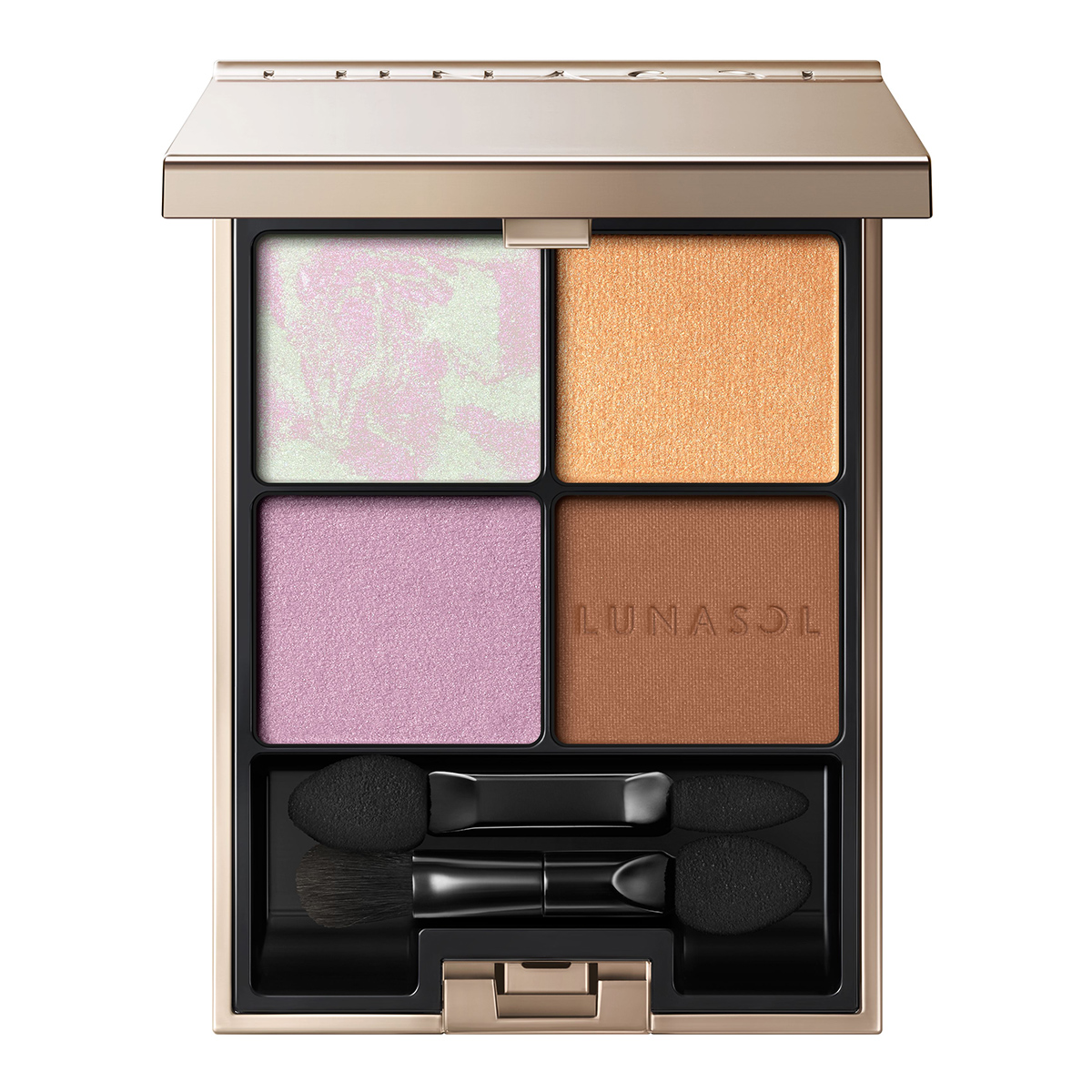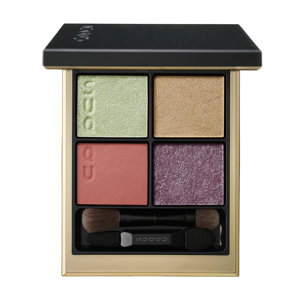 草木染めの柔らかな色合いからインスパイアされたアイパレット。今シーズンのラッキーカラーのブライトなグリーンや青みを含んだパープルのほか、ピンクやベージュもIN。澄んだきらめきでまなざしに華やぎを。
