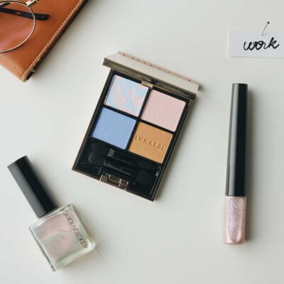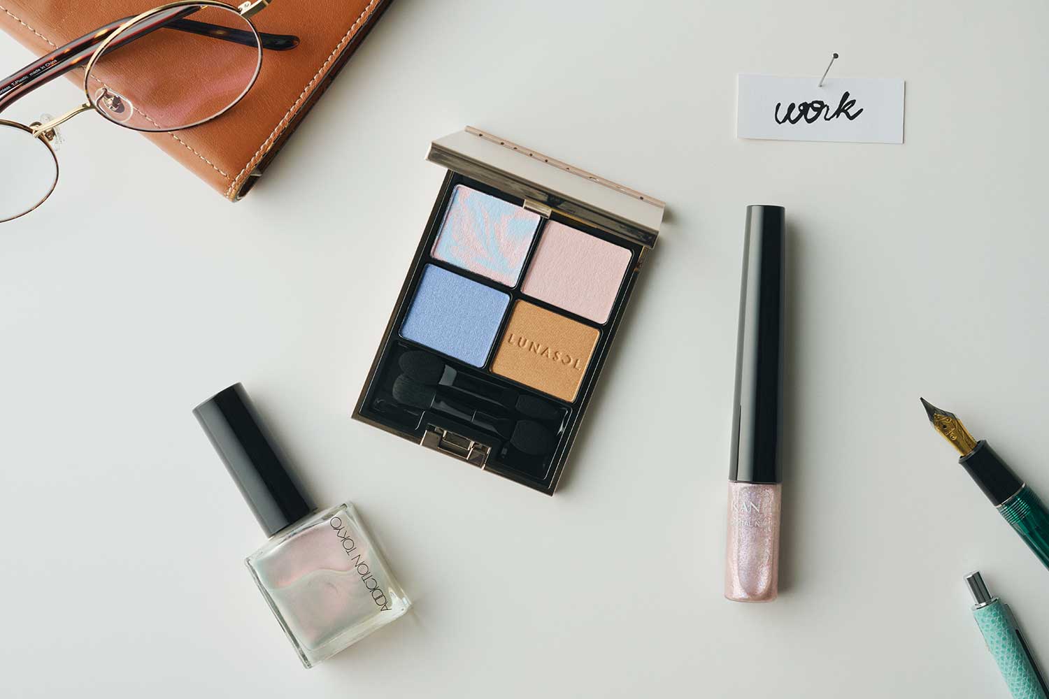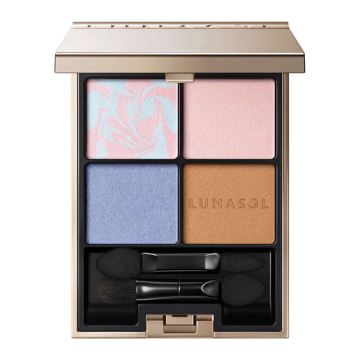 透け感が美しいブルー、淡いブルーが混ざったシルバーといった、仕事運の開運カラーがまとめてIN。まぶたにさらりとのせれば、儚げで可憐なムードを演出できる。さらにピンクやベージュを重ねれば、立体感も引き出せる。