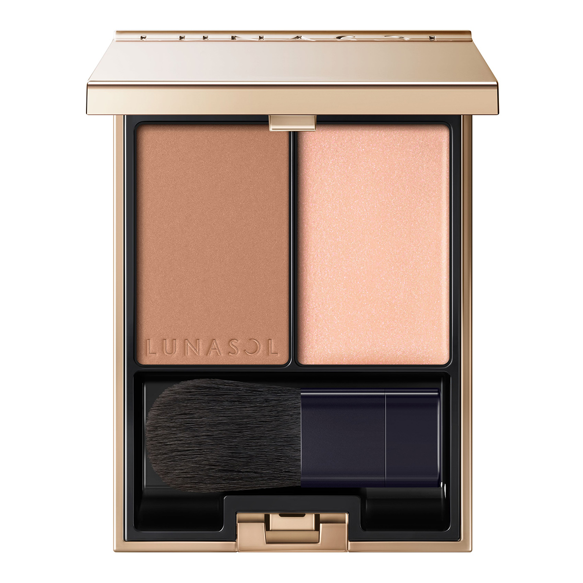 シェーディングに適した透け感のある発色の左側のブラウンには、赤みを潜ませることで肌なじみをアップ。右側のシアーなピンクはバームテクスチャー。つややかなカラーとピンクパールで柔らかな立体感を引き出す。