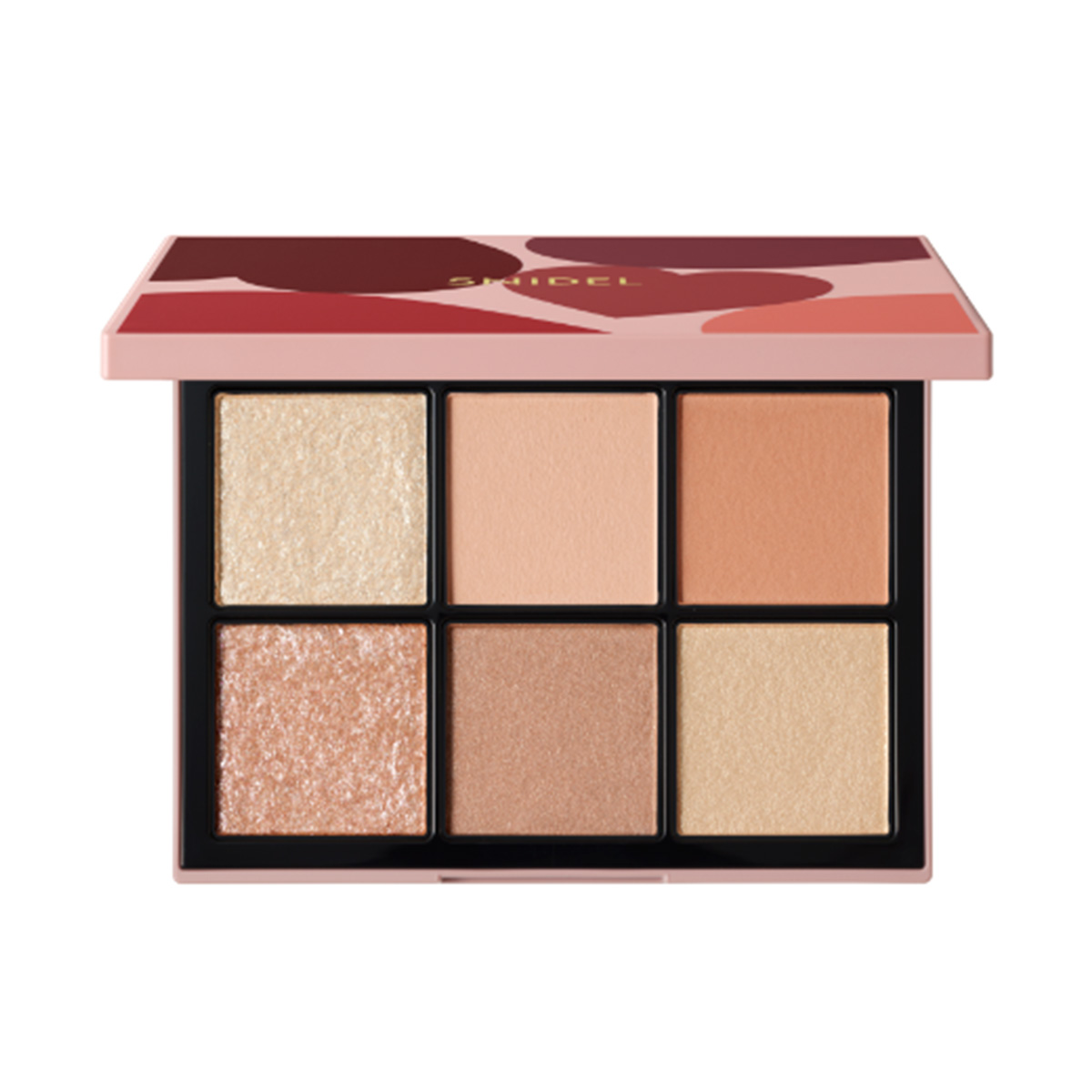 バレンタイン限定のスイートなパッケージに心が躍るアイパレット。ほのかな血色*を感じさせるマットなベージュカラーはミュートメイクに適しています。上段の中央、右端の2色を混ぜてアイホールと下まぶたに仕込んだら、上段の右端、下段の中央を目尻に重ねて目幅をフォロー。まろやかだけどぱっちりとした印象の目元が作れます。上段&下段の左端のきらめきカラーも肌なじみやすく、使いやすい。