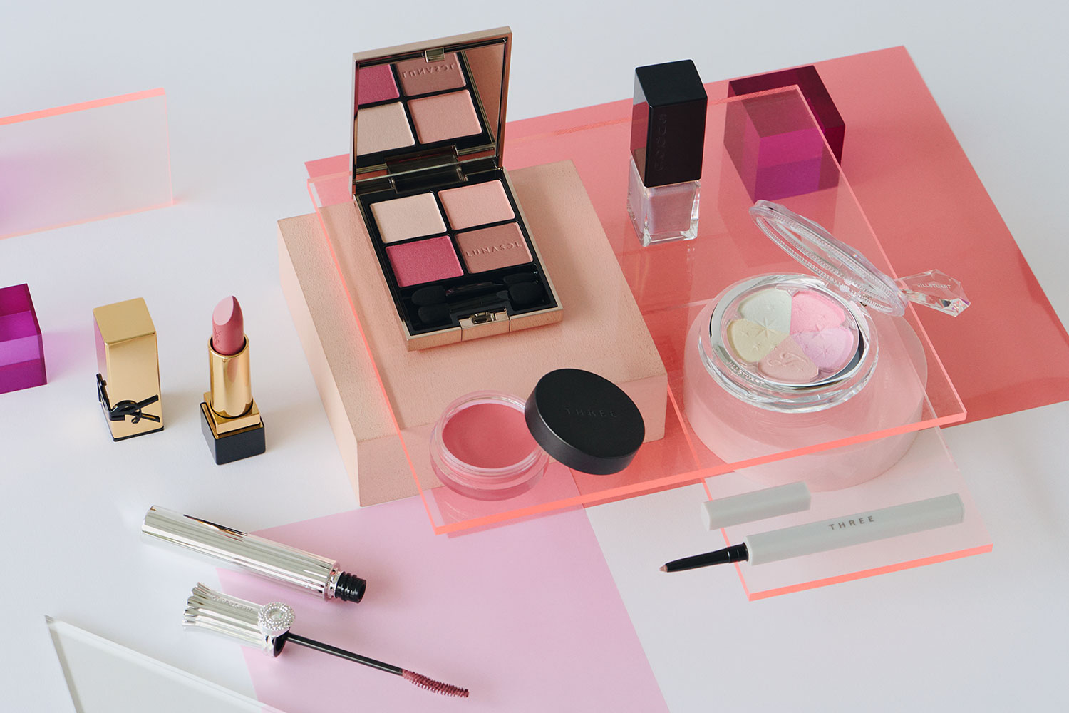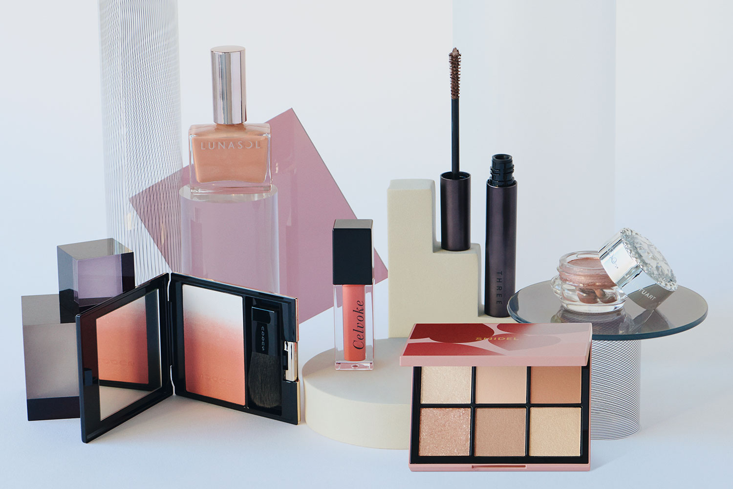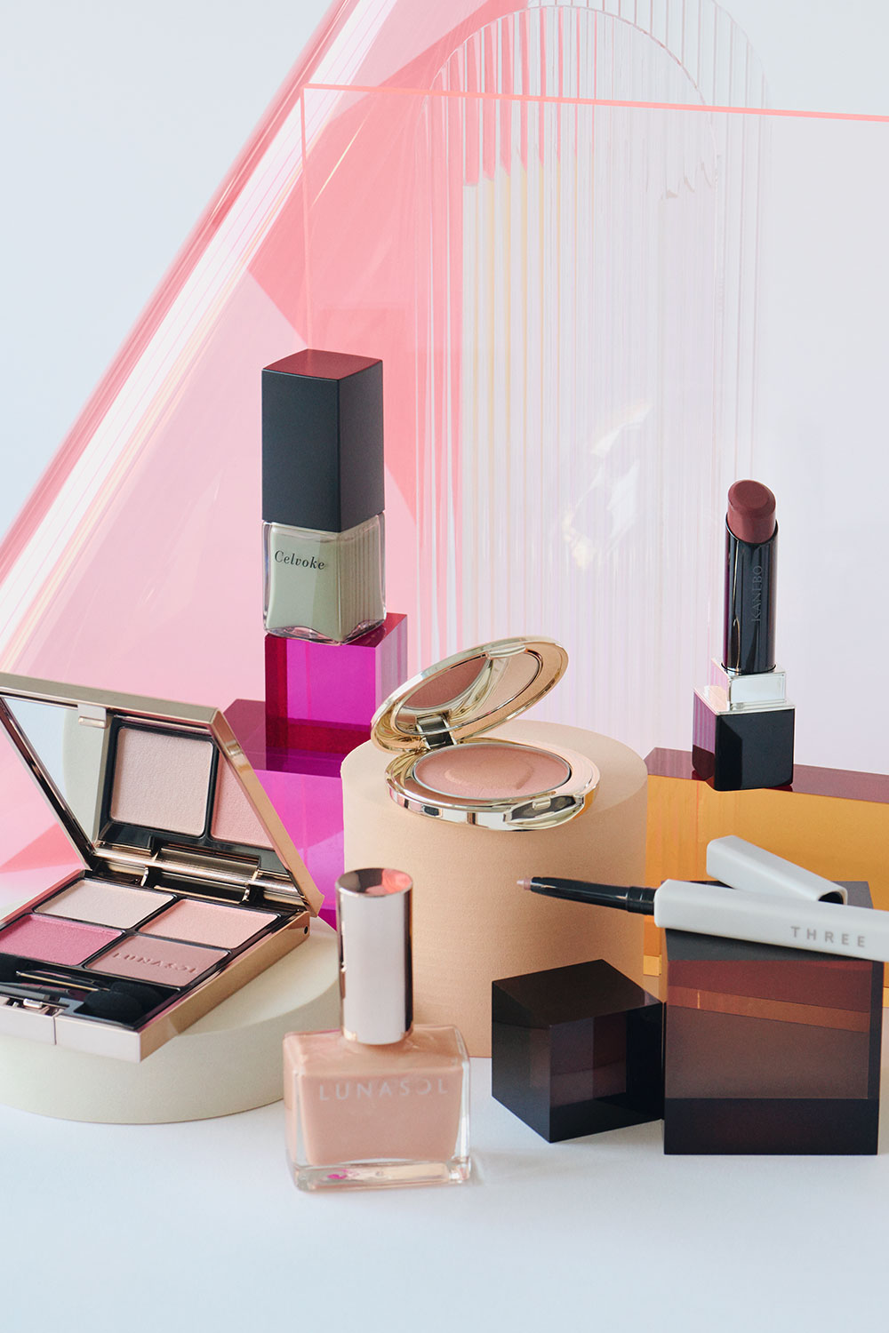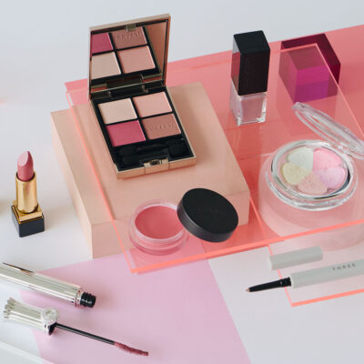 春になると恋しくなるピンク。中でもほんのり青みを帯びたピンクは、この春のトレンドカラーのひとつです。「肌色に合わない」、「目元に使うと腫れぼったい印象になりそう」、「大人が使うとイタくなる!?」などと、敬遠されがちですが、この春の新色たちは一味も二味も違います。絶妙な透け感のあるカラーで肌にするりとなじむだけでなく、ピンクの中に潜む青みが、くすみがちな大人の肌をカバーして透明感*1を底上げしてくれるのです。キーとなるのはチーク。ごく淡いピンクのチークを頰に広くぼかすことで肌トーンをふわりと上げ*2、それより濃いピンクで温もりある血色感*2をじわり。目元と唇の色を繋いでメイクに統一感が生まれるだけでなく、くすみもクマも目立ちにくくなる*2という効果があるのでシャドウやリップを別の色にするときにもぜひ。