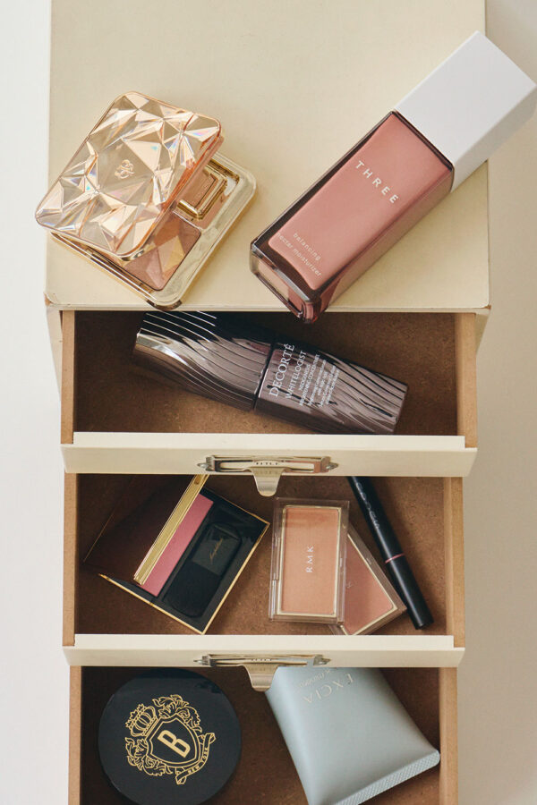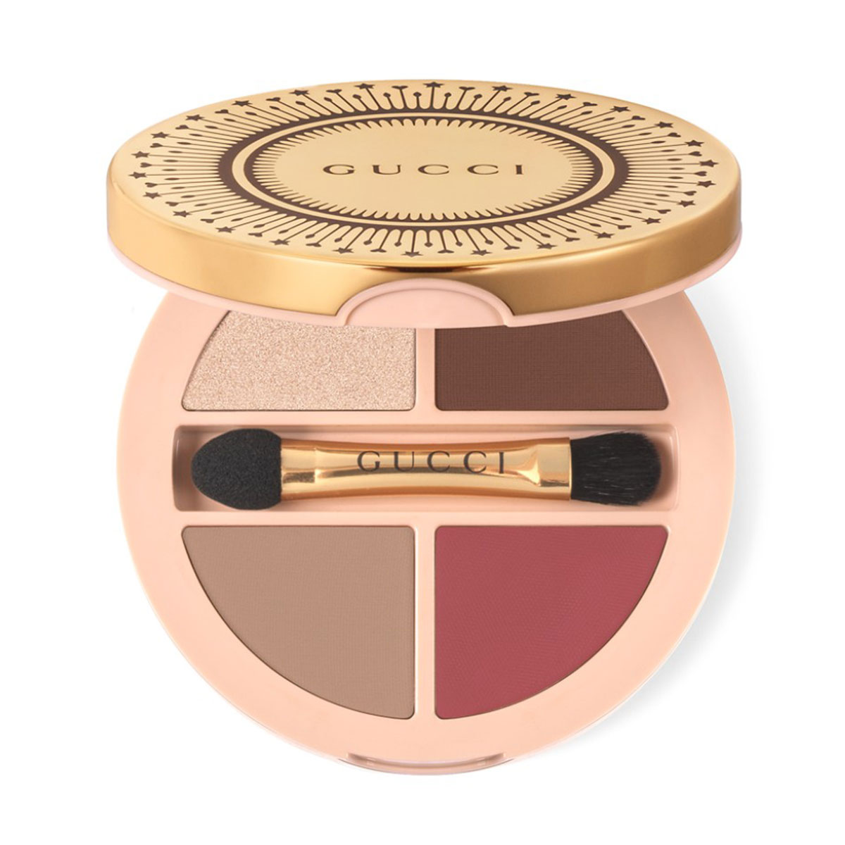 サテンとマット。2つの質感で美しい発色を叶える3色のパウダーは、シャドウやチークとして使用可能。パレットには、ほどよい血色感*とツヤを与える目元、口元、頰に使えるクリームもIN。1つで3役。旅のお供にもおすすめ。