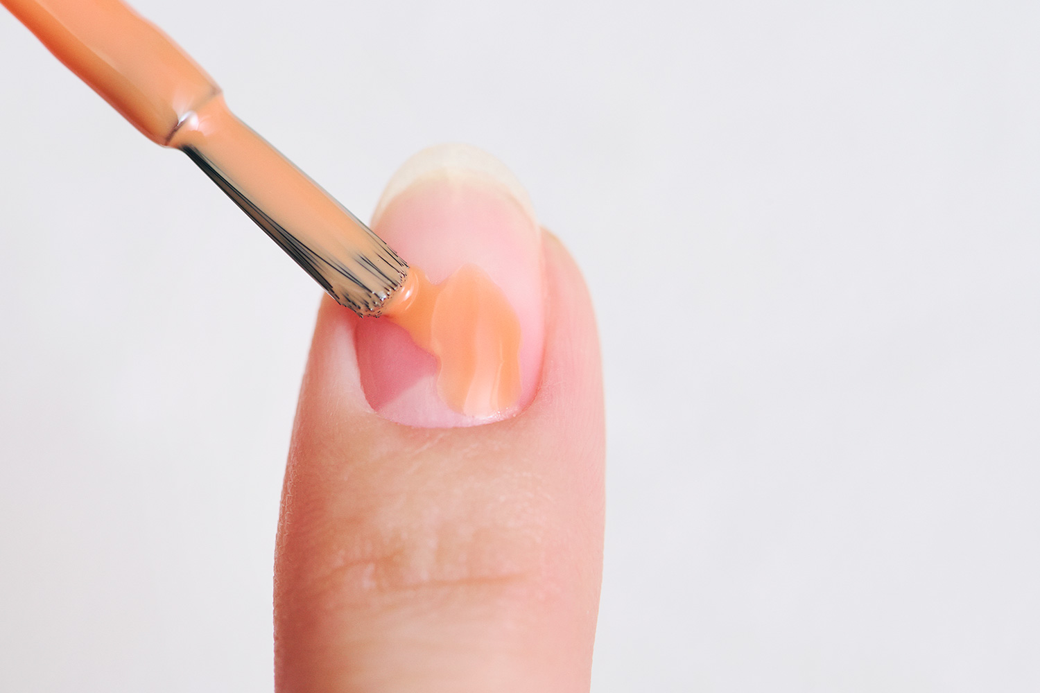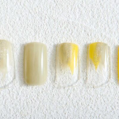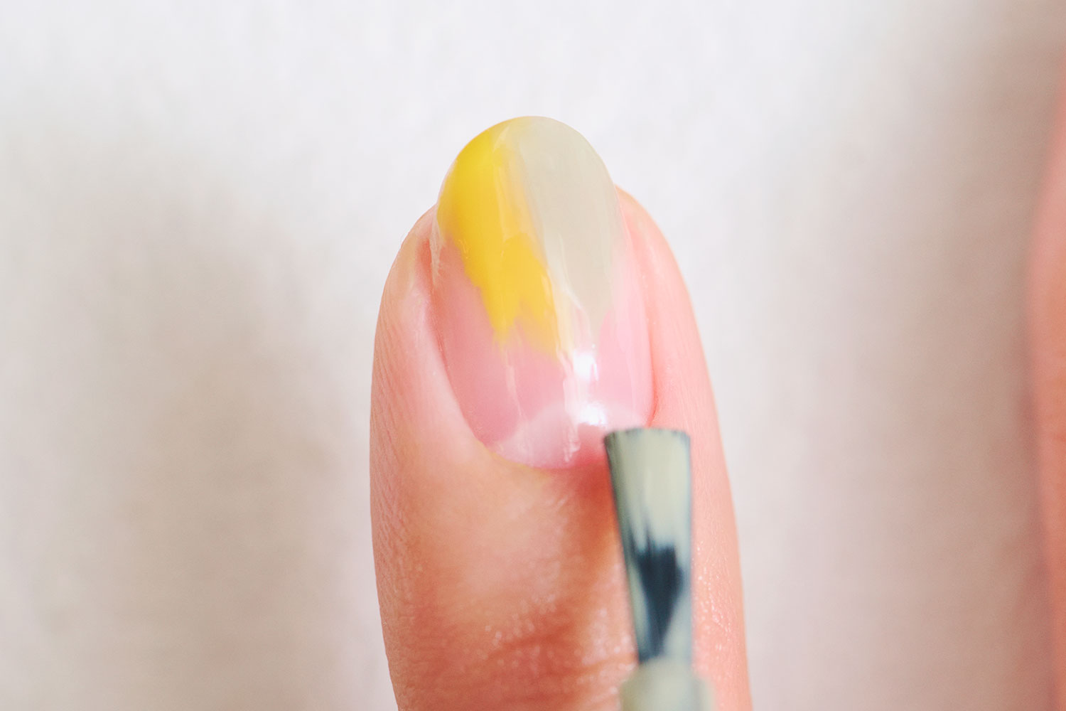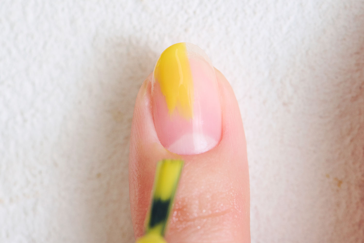 イエローのポリッシュを爪の先端から根元に向かってひと塗り。生え際までは塗らず、先端から全体の1/2〜2/3のあたりまで。