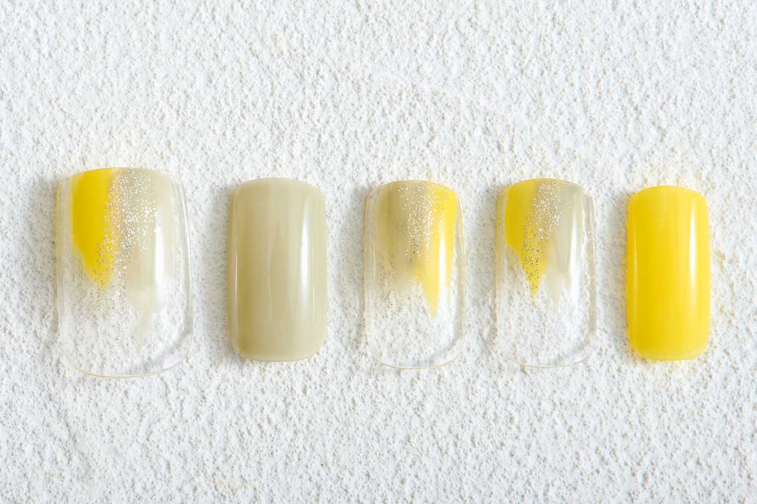 ①で塗ったイエローに少し重なるようにライトベージュを爪の先端から根元に向かって塗る。薄すぎる場合には2度塗りしてもOK。