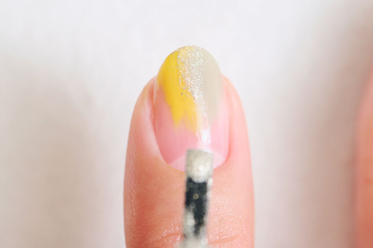 ①と②で塗ったポリッシュが完全に乾いたら境目にラメを重ねる。もちを高めるため、クリアなトップコートを重ねるとよりつややか&色もちアップ。