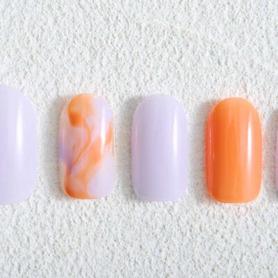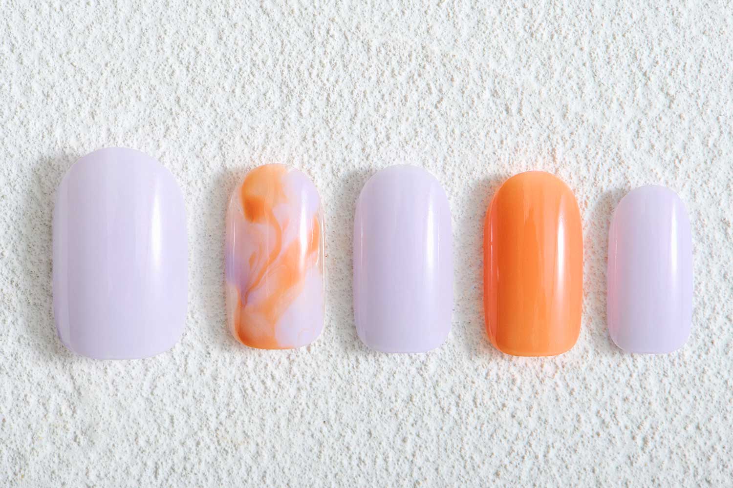 透明感を引き出すラベンダーとフレッシュなオレンジの春夏らしい組み合わせ。マーブルのアクセントは1本に絞ることで、大人に似合うアレンジに。一見、難しそうだけど乾く前に2色を混ぜるだけなので意外と簡単。きっちりやろうとせず、ラフに楽しむのが正解!