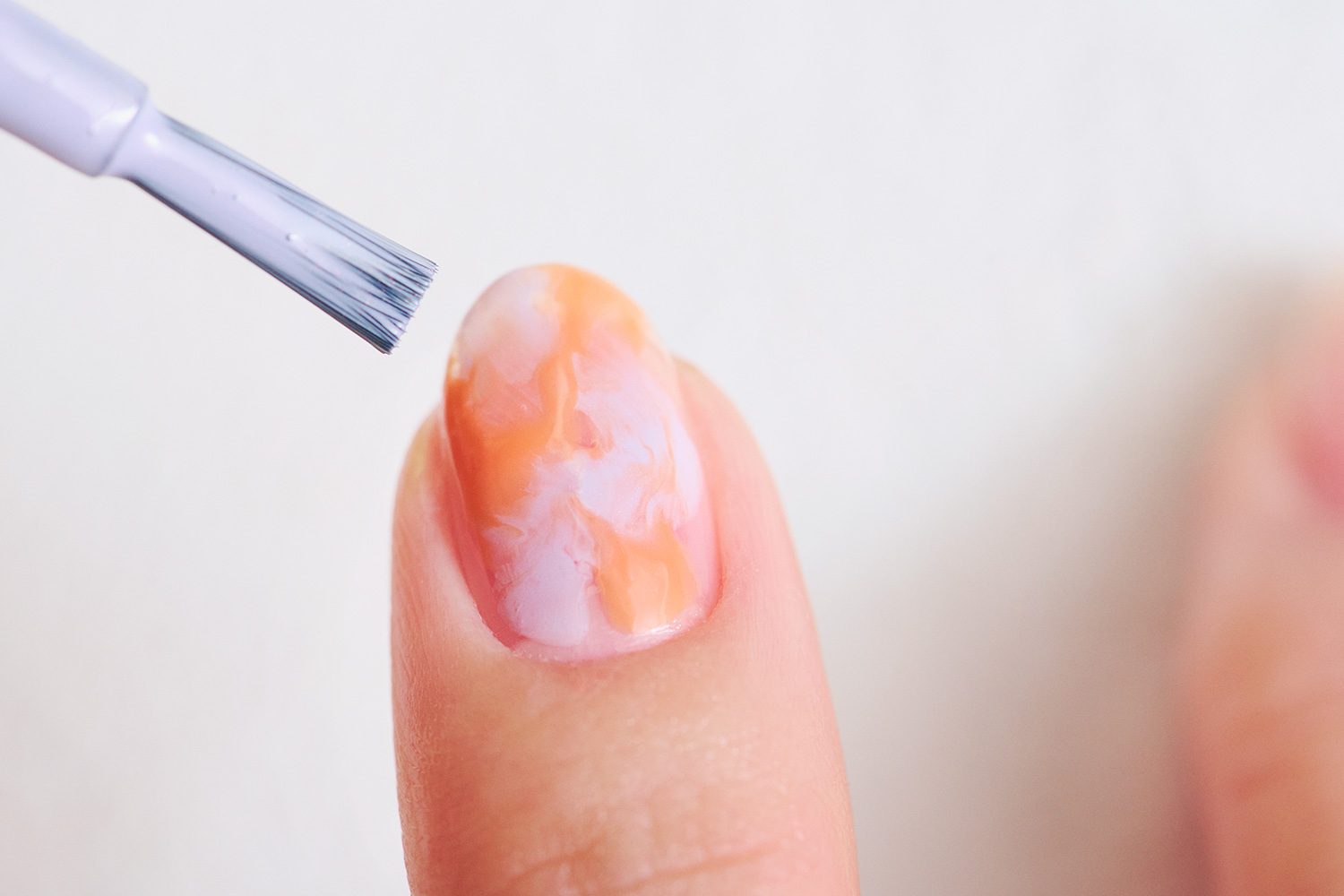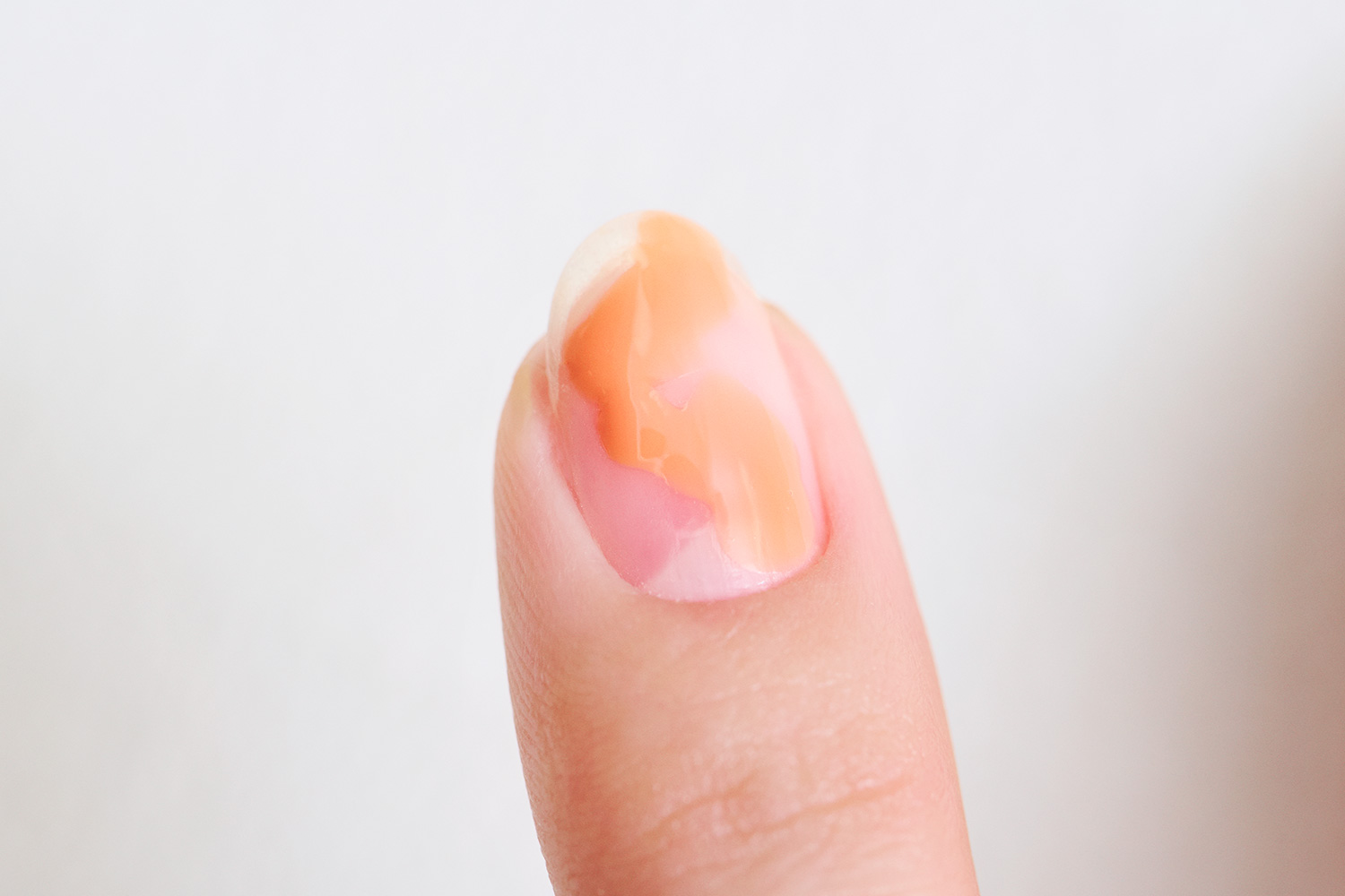 空いている部分にラベンダーをネイルの筆先で置くようにのせる。乾く前に筆先を使ってオレンジと混ぜてマーブル状に。