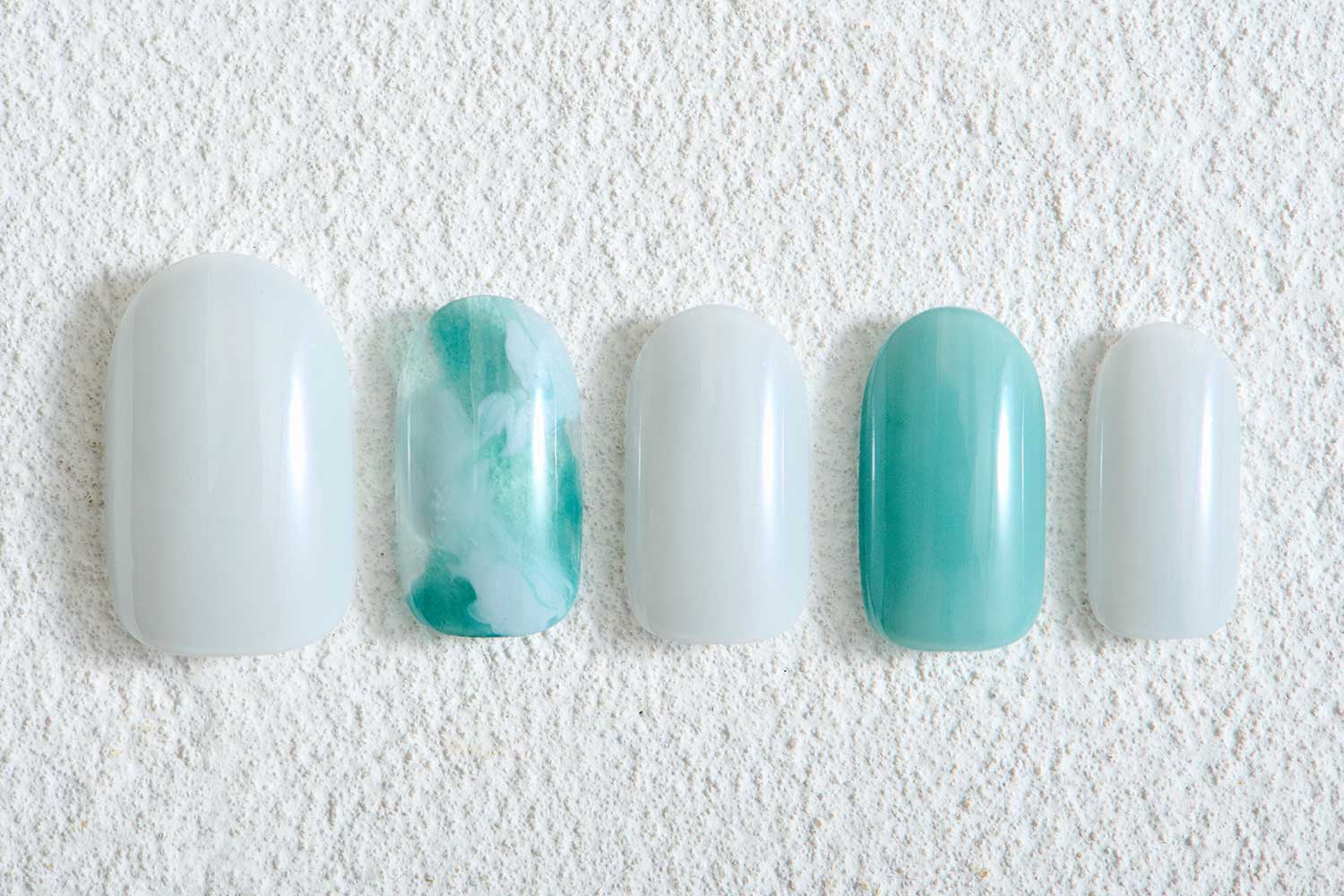 ほんのり青みを含んだグリーンだからペールブルーのネイルとも相性抜群。一度塗りなら爽やかなシアーグリーン、2度塗りなら深海みたいなディープなカラーが楽しめる。