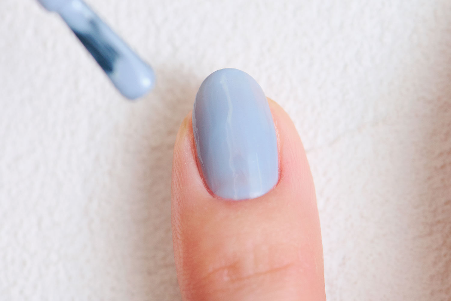 ヴィーガン仕様かつ心地よい使用感にこだわった人気シリーズの新作。パープルを感じるグレイッシュなライトブルーで涼やかな指先に。