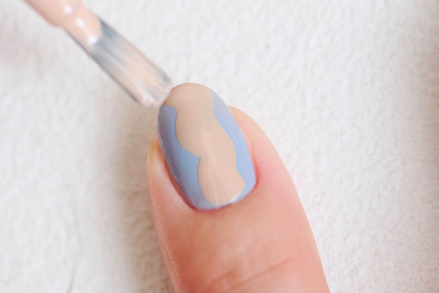 ベージュネイルをたっぷりと筆に取り、“うねうね”なラインを描く。その際、一筆で一気に描くのがポイント。他の色で行う際もこの“うねうね”ラインを描くカラーはしっかり発色するタイプがおすすめ。