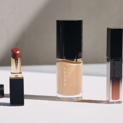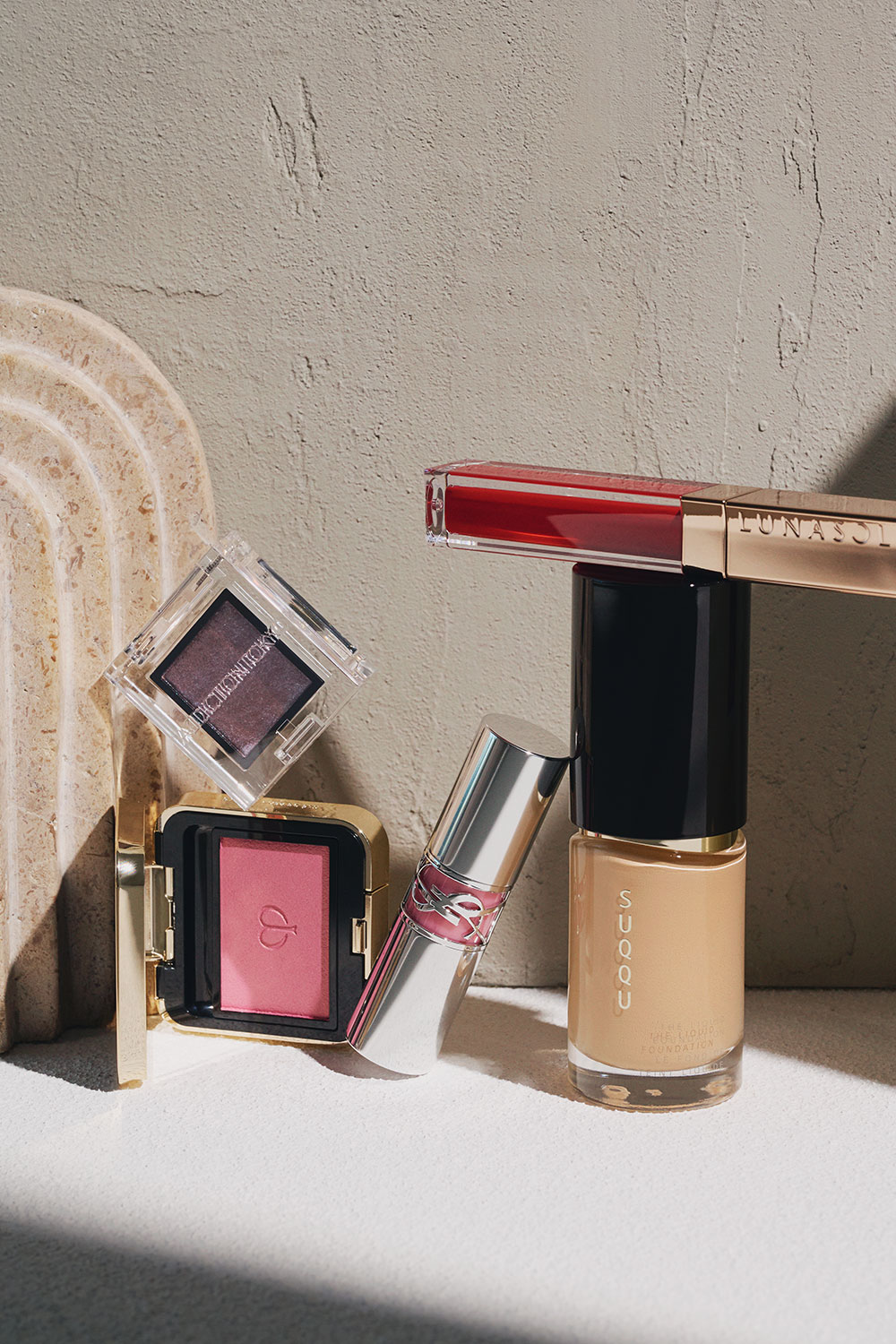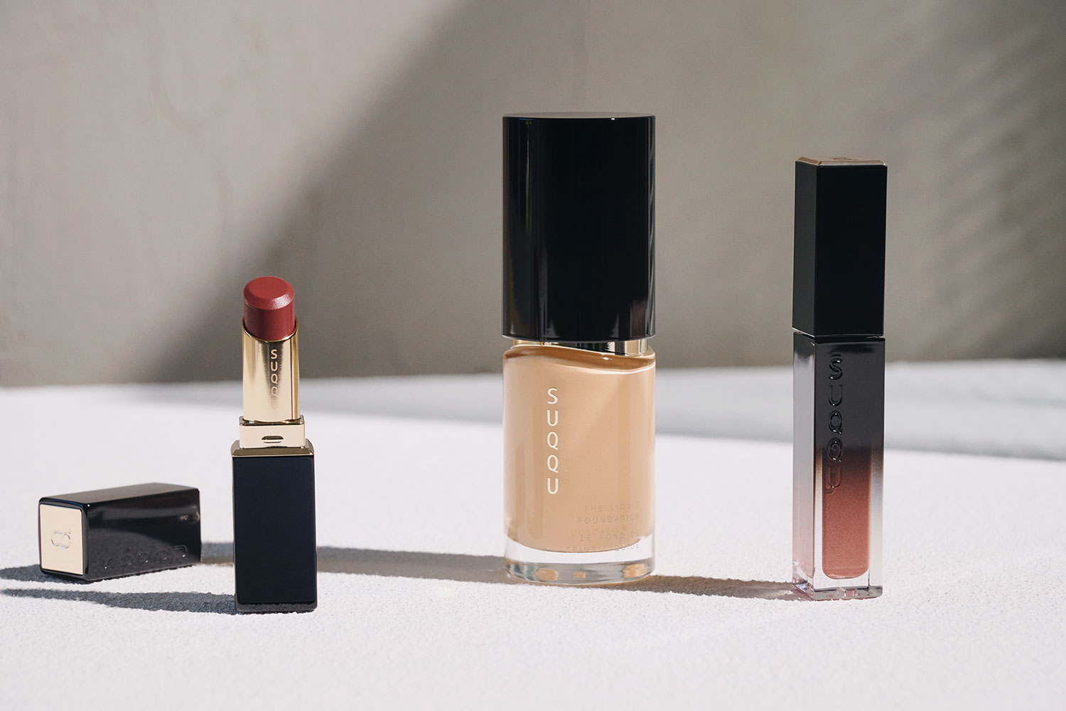 SUQQUからは、なめらかでつややか。清らかさを感じさせる肌に近づけるリキッドファンデーションときらめき*をまぶたに宿すリキッドシャドウ、そして新作のつやめきリップをレコメンド。つるりとした高輝度*な仕上がりに多くのファンを持つザ リクイド ファンデーション。くずれにくさ、生命力を感じさせる美しい仕上がりにヘアメイクさんや俳優さんにも人気です。昨年の夏に発売されたリクイド ラスター アイズは大きさの異なるパールを配合することでニュアンスあるきらめき*を叶えます。この春の新色の06は、ほのかな血色感*と眩い光*でこれからの季節にもぴったり。モイスチャー グレイズ リップスティックもこの春の新作。2024年上半期のリップのトレンドのひとつである、均一的で濃密なツヤの膜で唇を彩るタイプの中でも、大人の顔色をパッと冴えさせるカラバリで早くも大人気。写真の06はグレイッシュなモーヴカラー。シックだけどじゅわっとしたツヤで軽やかに楽しめます。